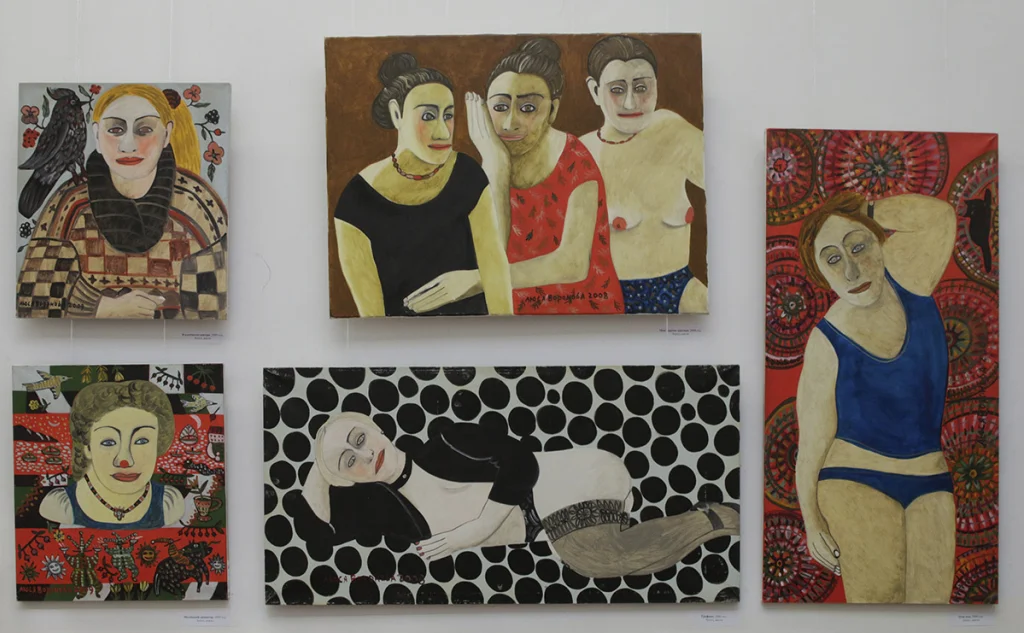 некий визуальный рассказ, где женские образы дополняются фигурами птиц и цветов. Работы выполнены в жанре наивного