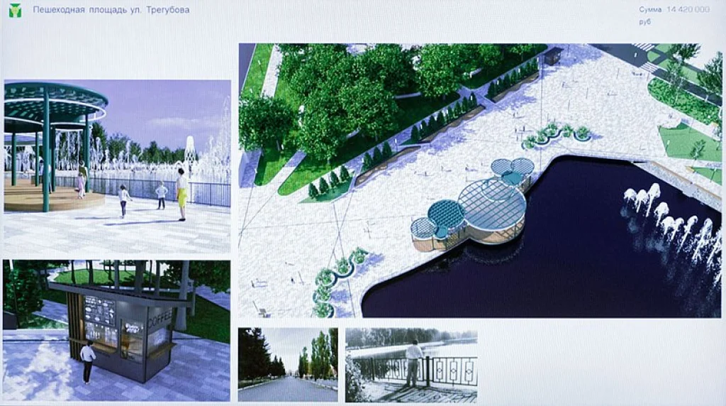Благоустройство общественного пространства разделено на 6 зон: городская площадь, детская площадка, арт-объект – фонтан со световой инсталляцией, зона ансамбля навесов с многофункциональными малыми архитектурными формами, прогулочная зона, зона отдыха у пруда с площадкой для отдыха на открытом воздухе, центральная входная группа со стороны ул. Трудовая.