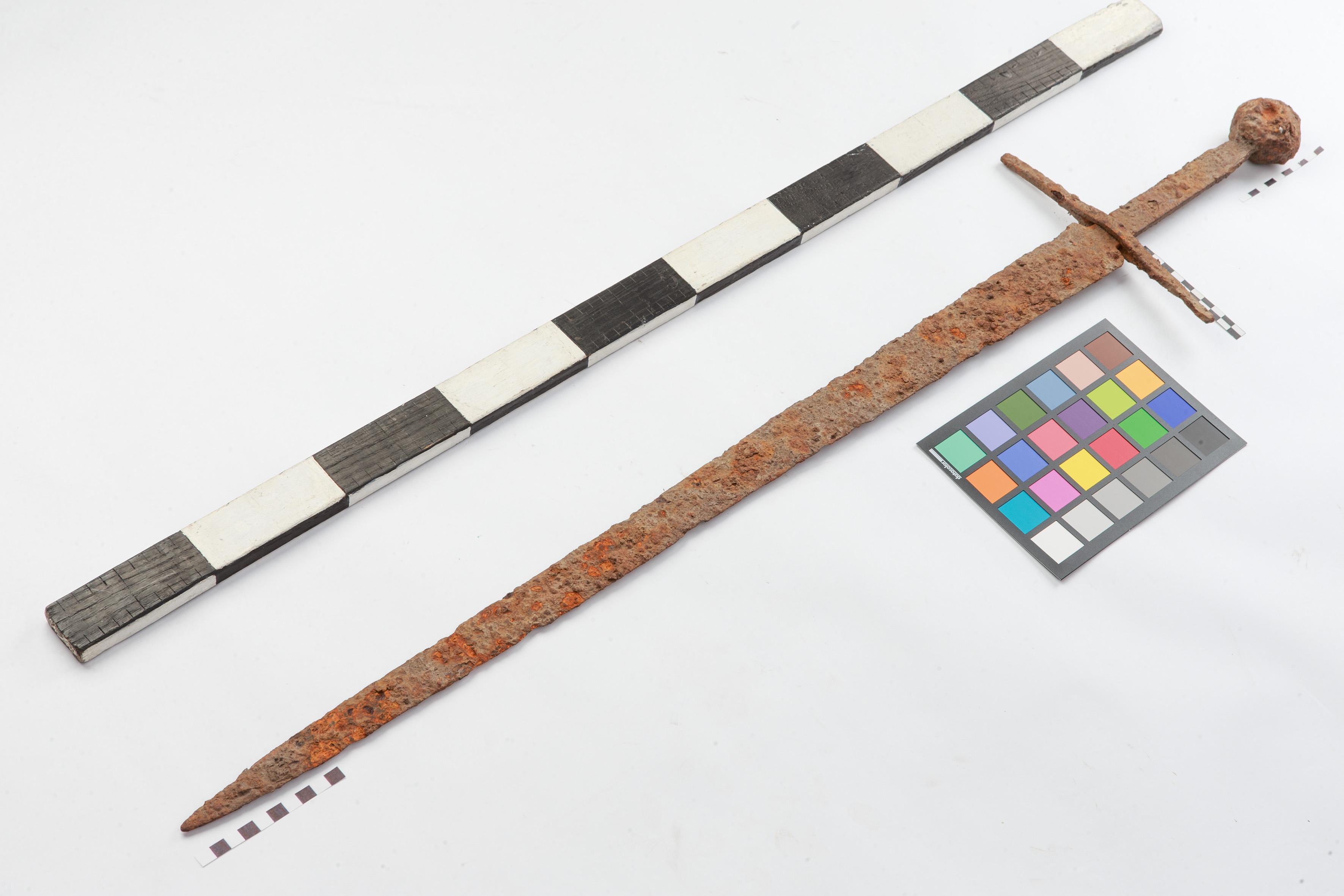 На мече обнаружили остатки трех клейм. Мастер той эпохи выполнил всечку. Меч значительно изъеден коррозией. Специалисты пытаются остановить химическую реакцию, которая все еще может повредить оружие. Для экспоната потребуется индивидуальная витрина с особым режимом хранения.