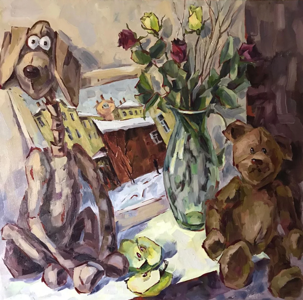 Художница постаралась объединить на одном холсте натюрморт и пейзаж. На картинах слились два города: центр старинной Тулы и провинциальные виды Крапивны.