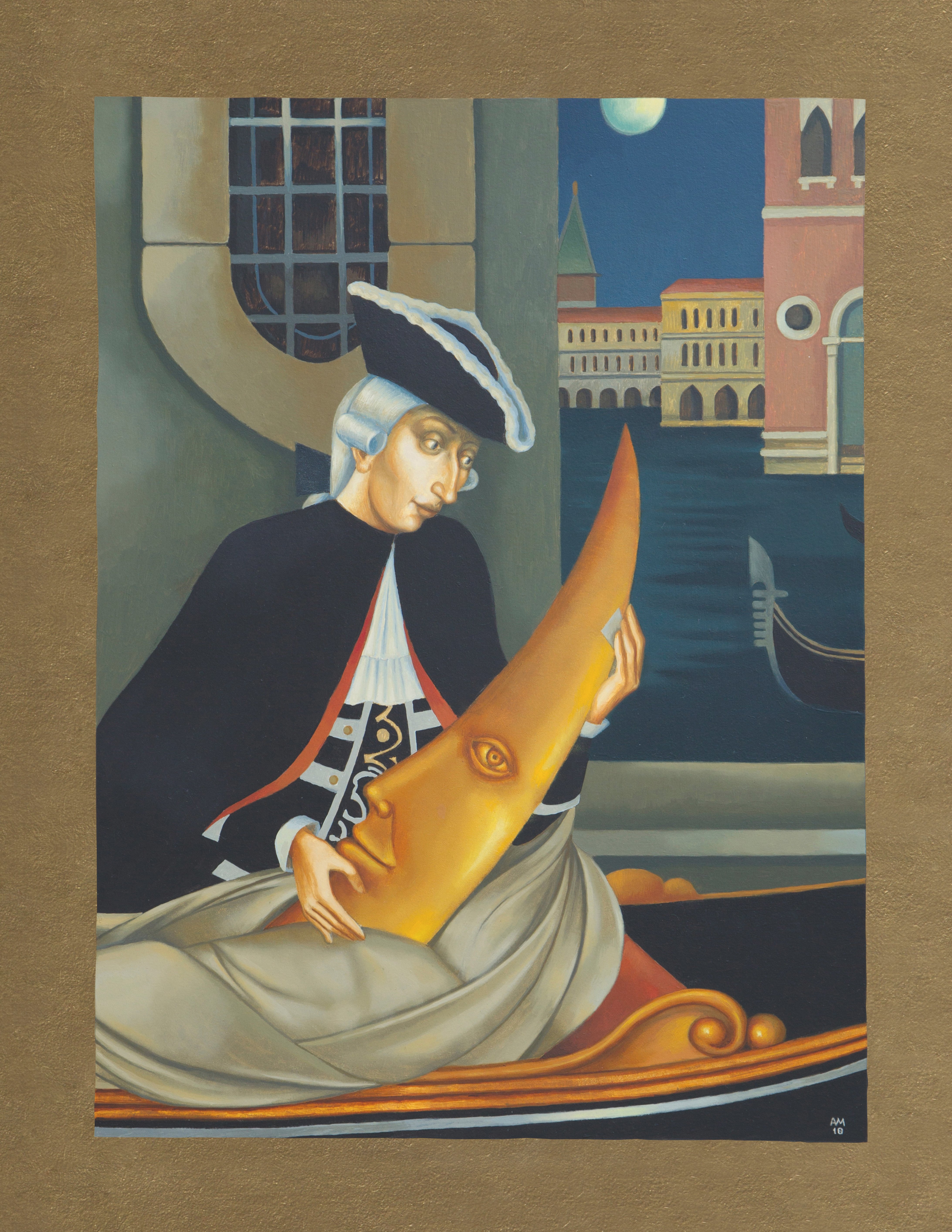 – Венеции посвящен цикл «Венецианская прогулка». Венеция – это один из моих любимых городов. В то же время через весь цикл рефреном проходит тема российской культуры. Например, на одной из работ – Александр Сергеевич Пушкин, который в Венеции никогда не был, он вообще не был за границей, но после смерти в его бумагах нашли замечательное стихотворение, посвященное Венеции. У меня Пушкин выглядывает из-под своей посмертной маски, тут обыгрывается тема карнавала. Есть посвящения Стравинскому, Бродскому которые очень любили Венецию и в ней похоронены.