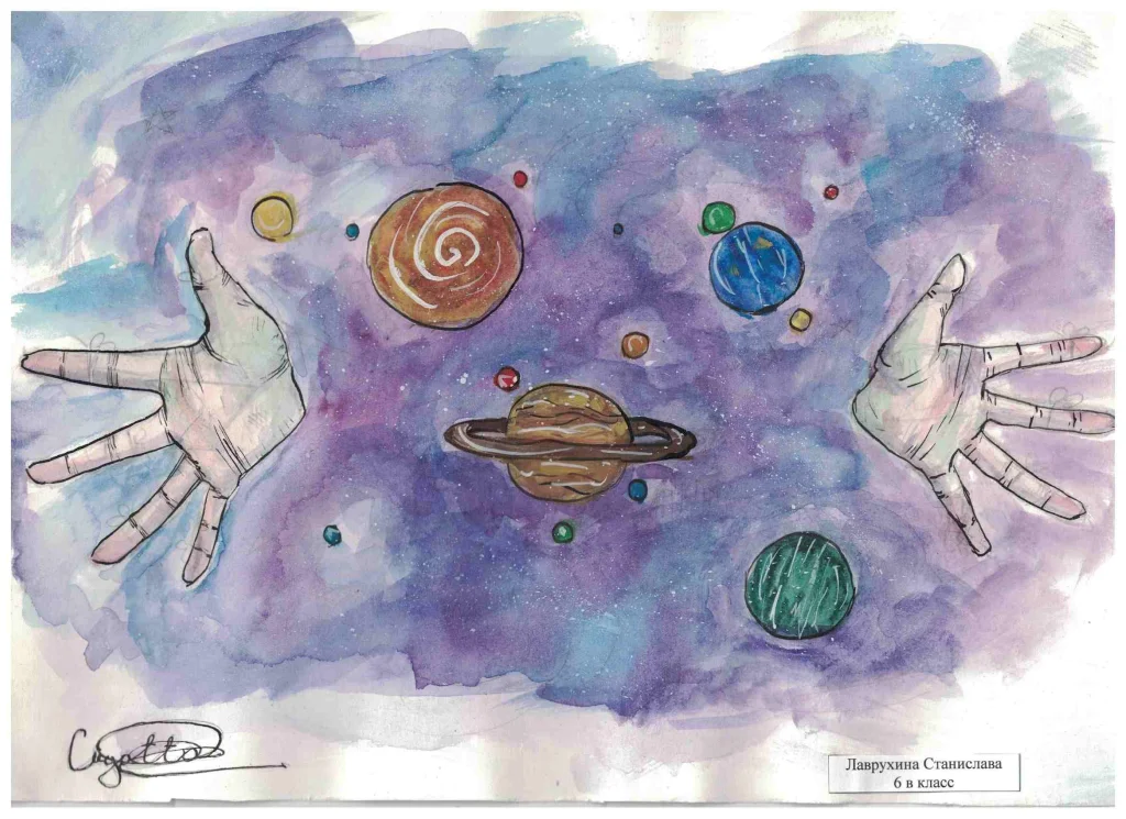 12-летняя жительница Тульской области Станислава Лаврухина участвовала в специальной номинации для детей до 13 лет «Сказки о космосе» и представила на конкурс рисунок «Космос на ладонях».