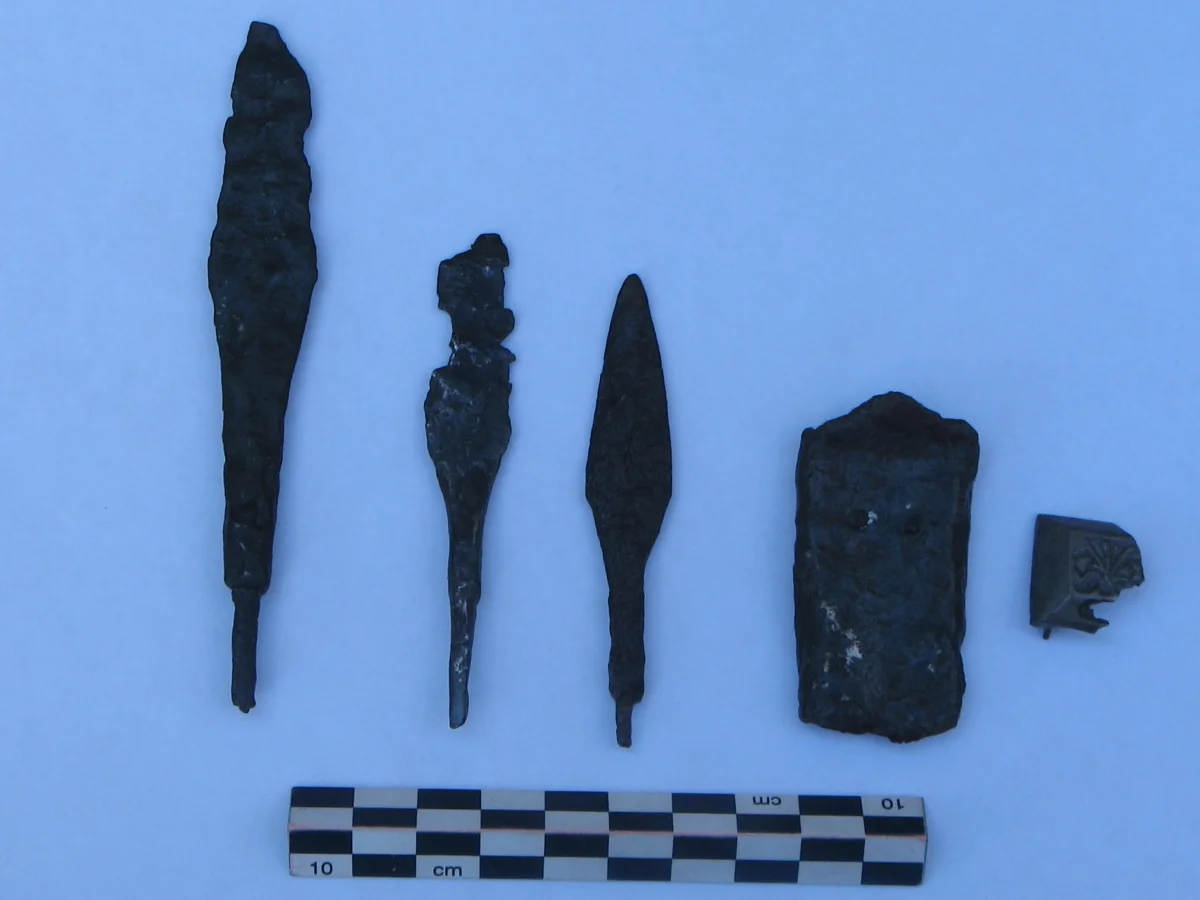 Среди них - наконечники стрел, наконечник метательного копья сулицы, пластины панцирных доспехов, бляха с монгольским орнаментом и т.д.