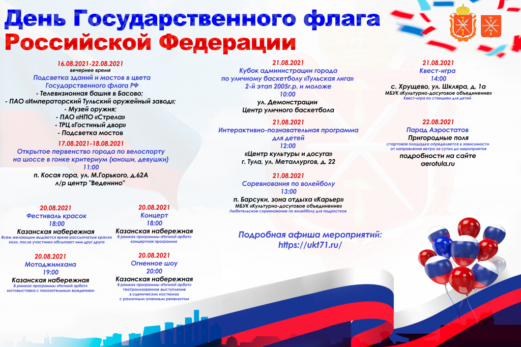 Кроме того, С 16 по 22 августа телебашня в Басово, Тульский оружейный завод, Музей оружия, здание НПО «Стрела», ТРЦ «Гостиный двор» и городские мосты будут подсвечены цветами российского триколора.