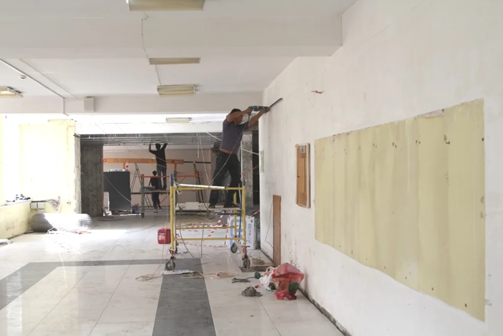 Сделана стяжка пола в фойе, почти выложена напольная плитка. Такие же работы идут на 2-м и 3-м этажах. После их завершения рабочие начнут ремонт стен и монтаж подвесного потолка.