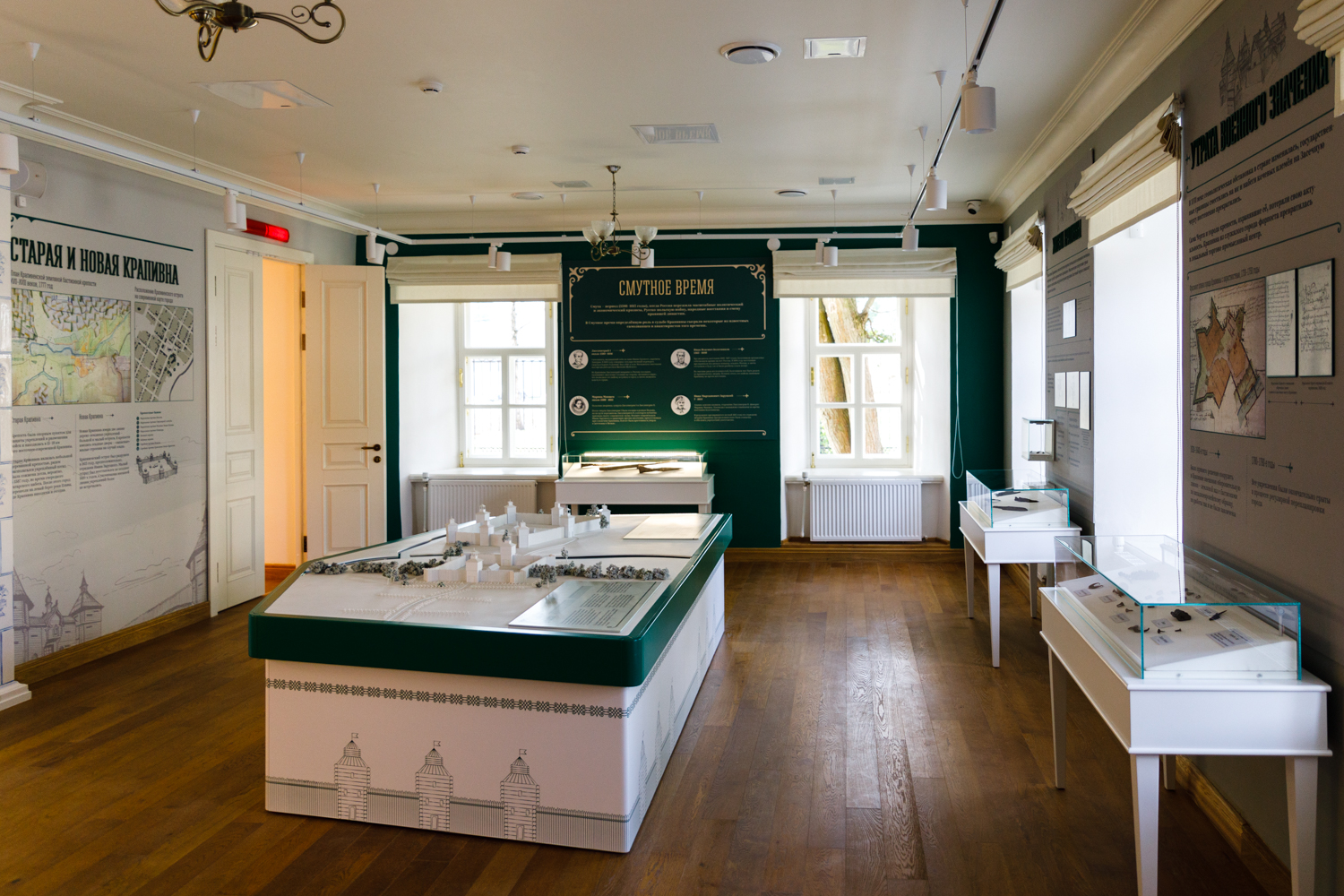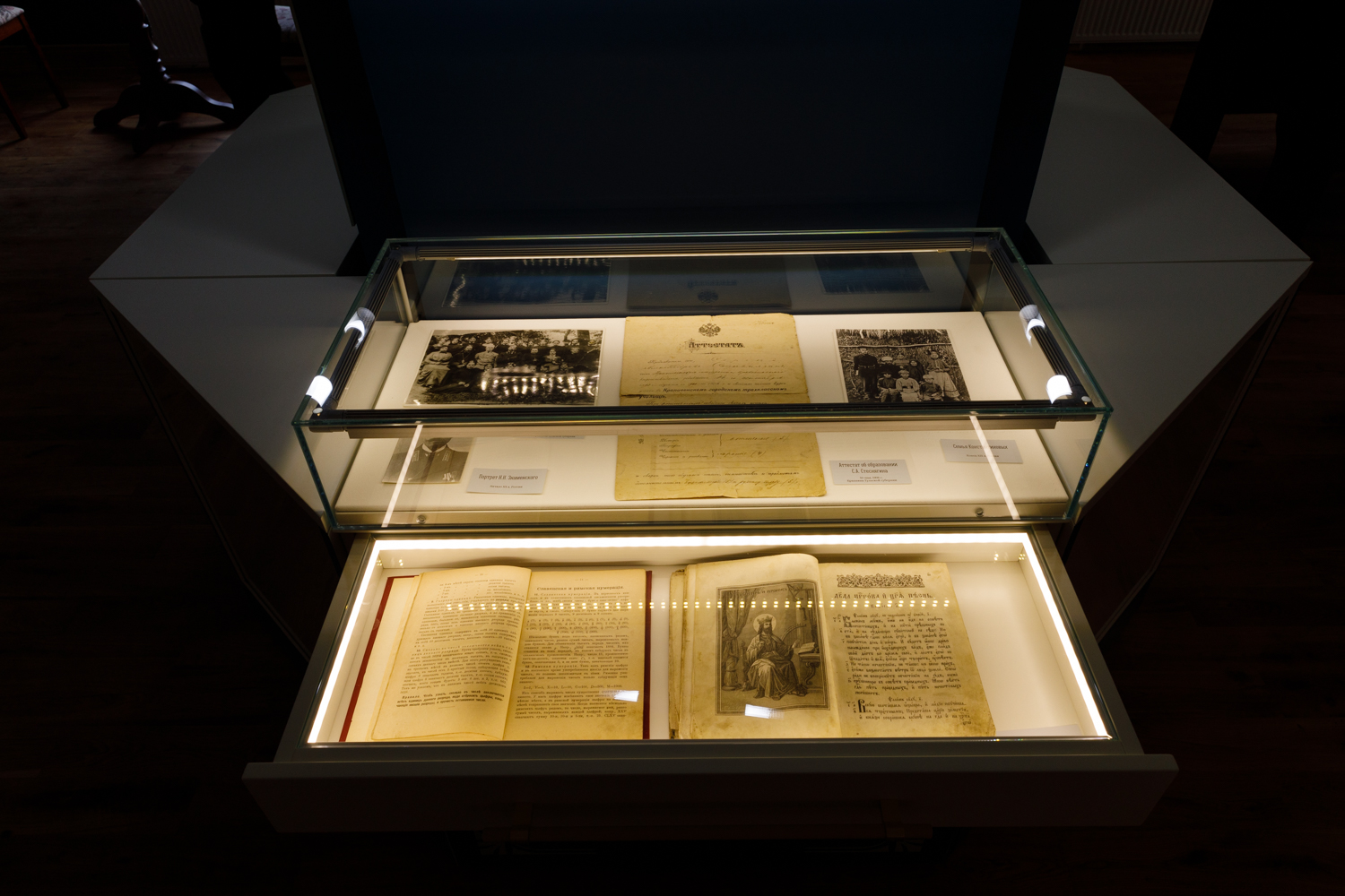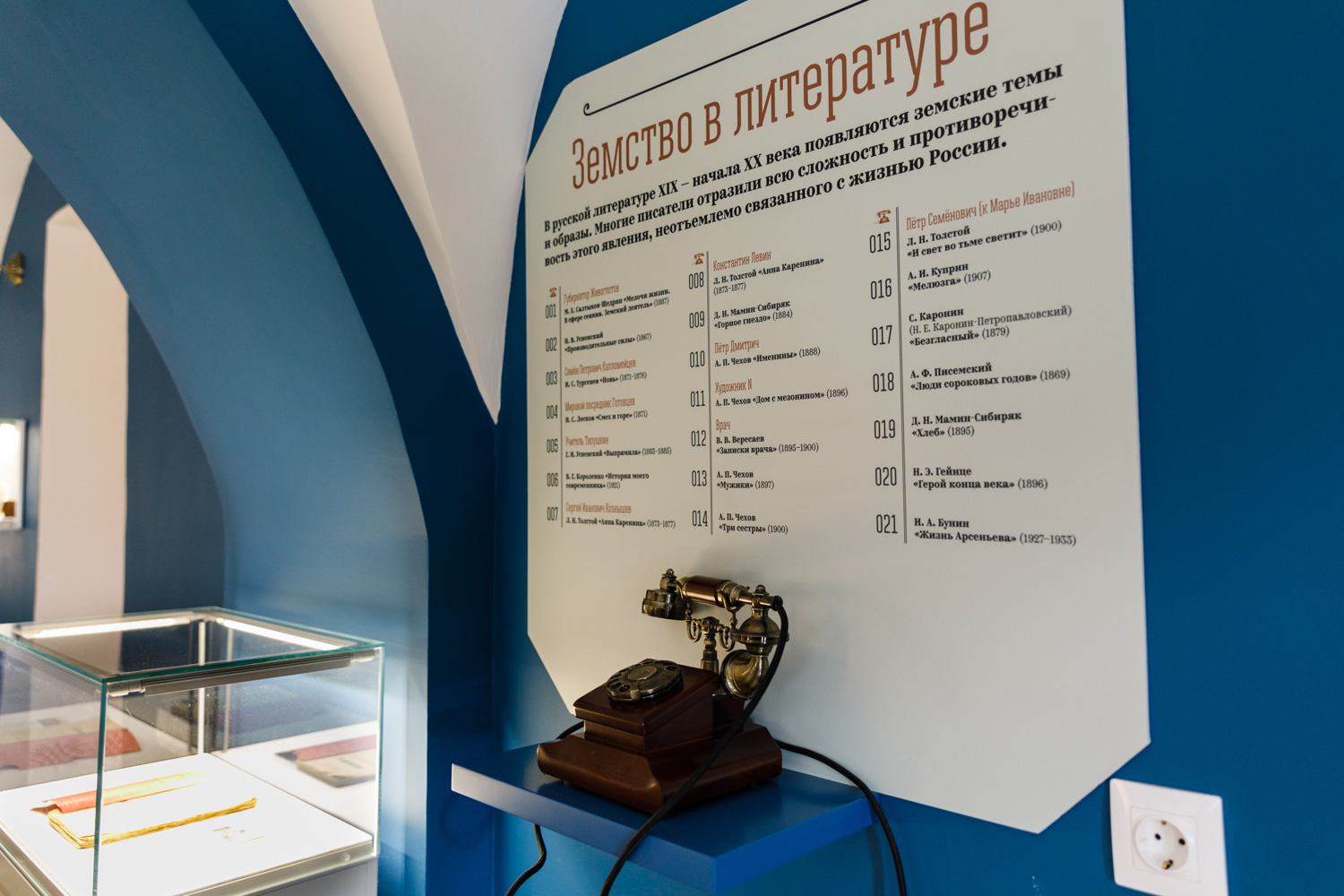 Выставочное пространство нового музея условно разделили на две части: экспозиция первого этажа посвящена градостроительству и истории самой постройки, а на втором этаже посетители могут узнать о разных сферах деятельности земства: образовании, медицине, страховании, финансах.