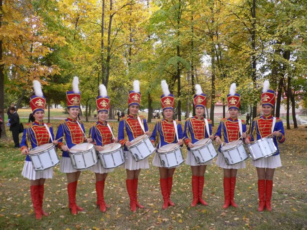 Участники парада - школьники, их родители, а также отряд барабанщиц.
