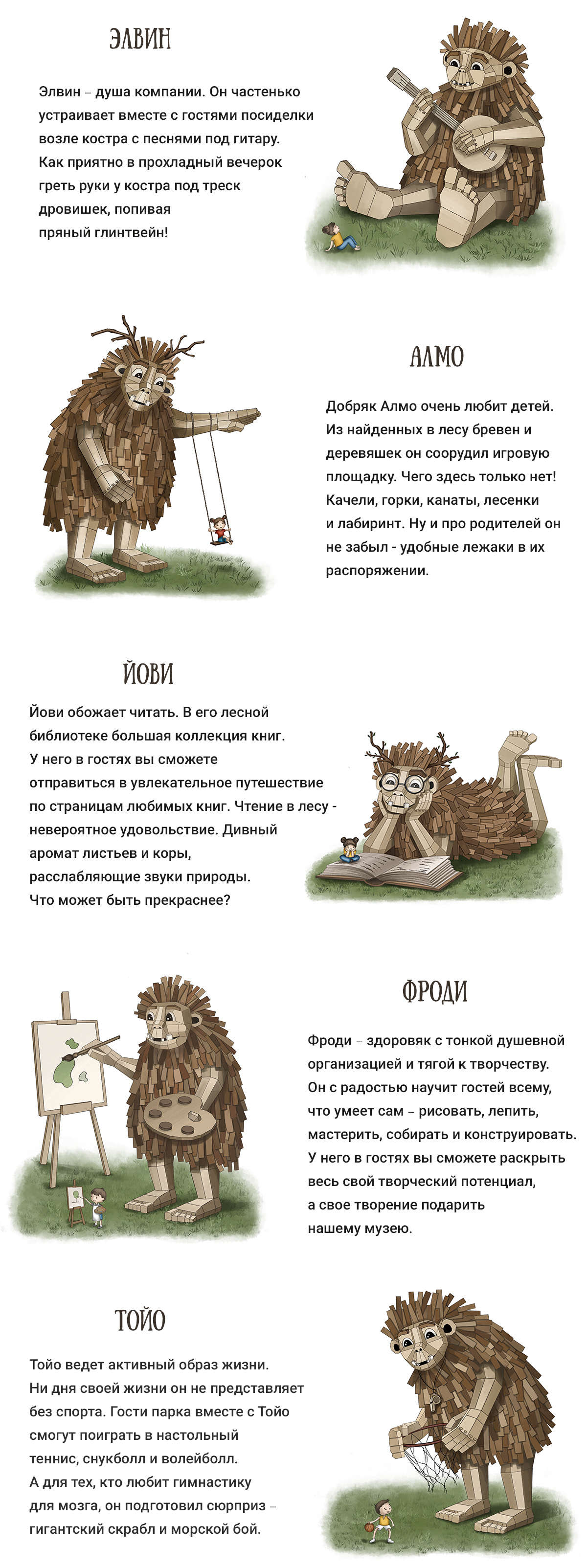 Предполагаемая дата открытия — лето 2022 года, а сейчас супруги работают над своими лесными йети в мастерской — создают полигональные части скульптур. С приходом тепла же они поставят каркасы, организуют инфраструктуру для комфортного проживания в кемпинге. Кстати, у каждого йети уже есть свое лицо, имя и характер.