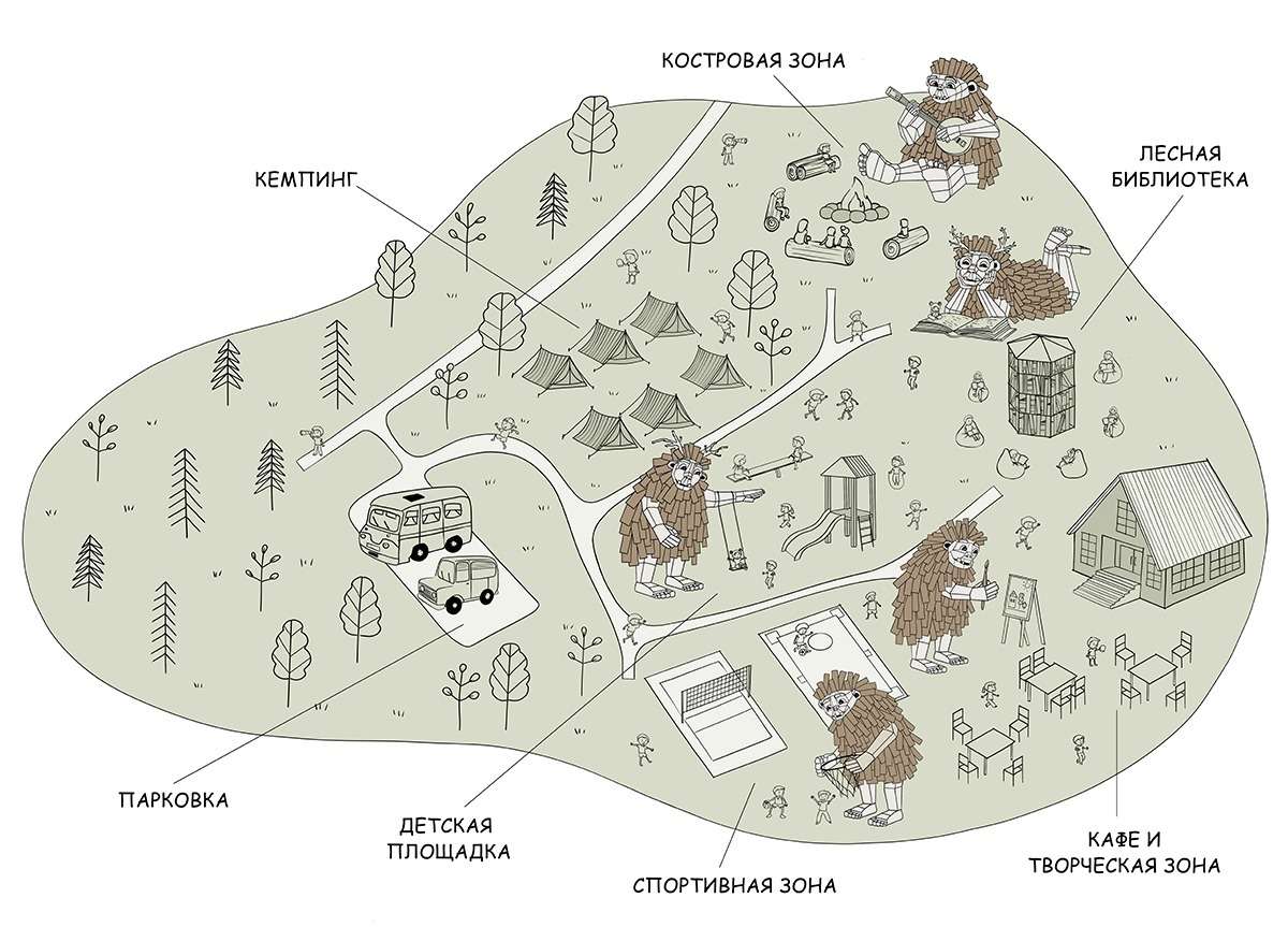 Парк построят в Тульской области, в 110 км от Москвы, и на данный момент организаторы уже договариваются с владельцем участка о долгосрочной аренде. Парк будет состоять из нескольких тематических зон: кемпинг, костровая зона, лесная библиотека, детские и спортивные площадки, а также пространство, предназначенное для творчества.