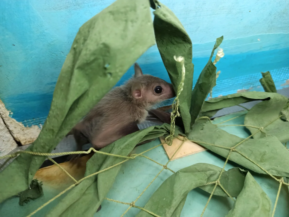 Щенок родился еще в январе, но все это время жил с мамой в лаборатории. Как только он научился летать и добывать пищу, их переместили к остальным крыланам.