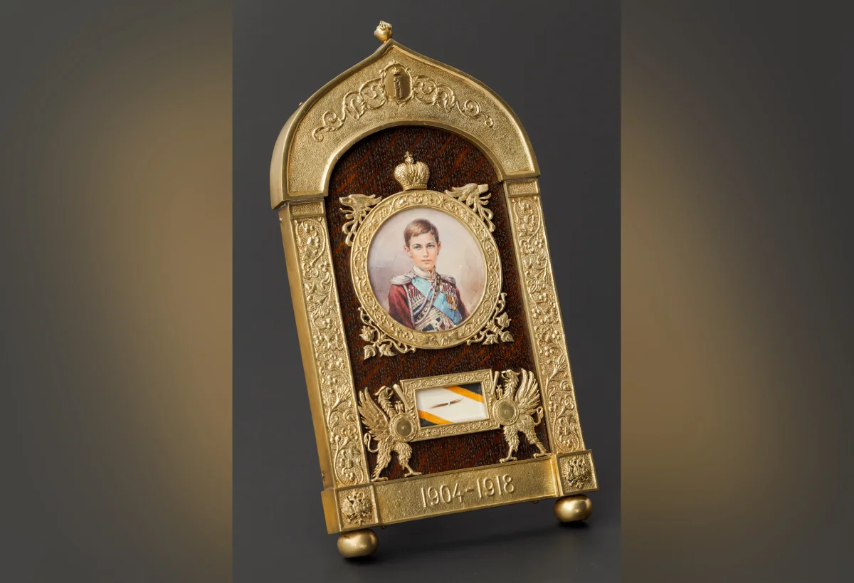 В центре экспозиции - уникальная мемория, представляющая собой раму-реликварий с портретом и прядью волос цесаревича Алексея.