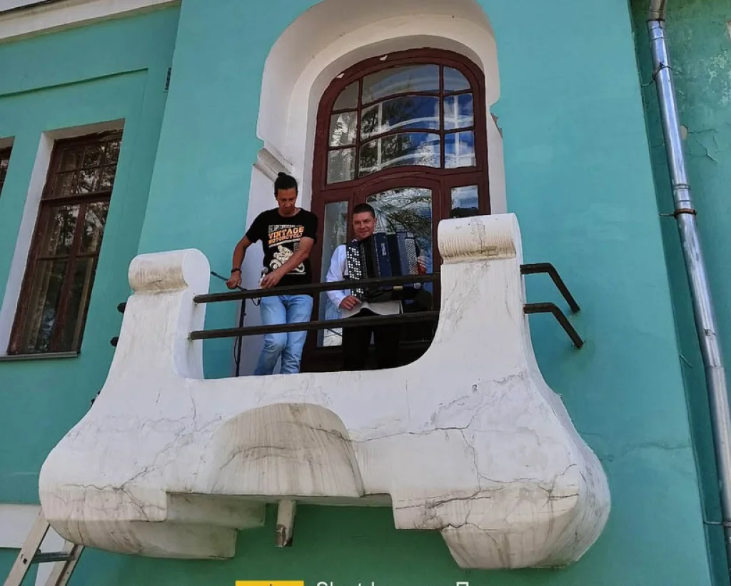 На этот раз на живописном балконе тульского музея играл баянист - Денис Агафонов, педагог ДШИ им. Г.Г. Галынина