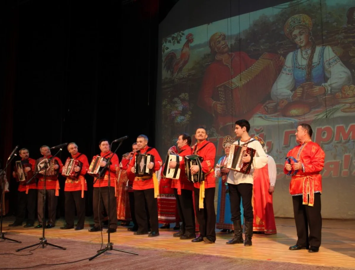 В фойе концертного зала проходила выставка гармоний и экспозиция фотографий. Гости мероприятия могли отведать
