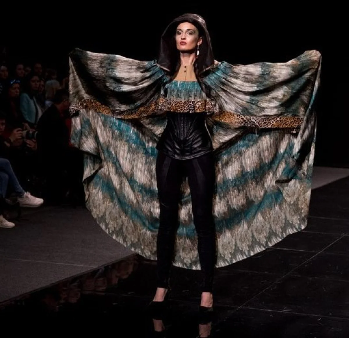 Она представила главную идею дизайнера. Она вышла на подиум в черном, изготовленном вручную кожаном корсете, брюках с вставками из кожи и длинной, развивающейся при каждом движении, накидке.