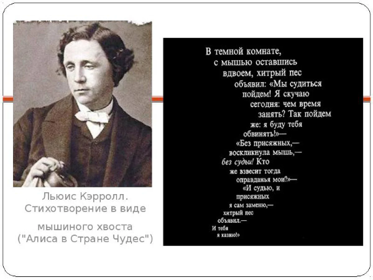 Для участия необходимо написать стихотворение длиной не более 60 слов, на тему «Страна чудес» (в формате Word) и прислать его организаторам. Есть главное условие! Оно должно повторять форму стихотворения в виде мышиного хвоста из книги Л.Кэрролла "Алиса в стране чудес" (смотри картинку). От одного человека принимается только одно стихотворение.