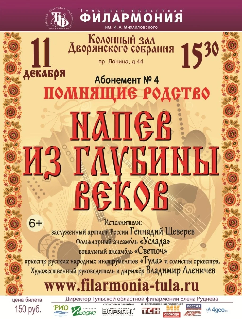 Колонный зал Дома Дворянского собрания Тульской областной филармонии приглашает на концерт «Напев из глубины веков» из абонементной программы «Помнящие родство»