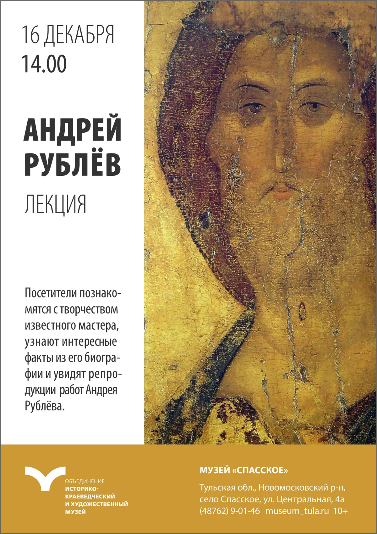 Лекция приурочена к 655-летию со дня рождения великого древнерусского живописца. Посетители познакомятся с творчеством известного мастера, узнают интересные факты из его биографии, увидят репродукции его наиболее известных работ. Лекция интересна своим содержанием, видеорядом и возможностью соприкоснуться с уникальным жанром русского искусства – иконописью, увидеть его прелесть и неповторимость. Также участники лектория смогут увидеть находящиеся в постоянной экспозиции нашего музея подлинные иконы первой половины XIX в., выполненные в мастерской Андрея Рублёва.