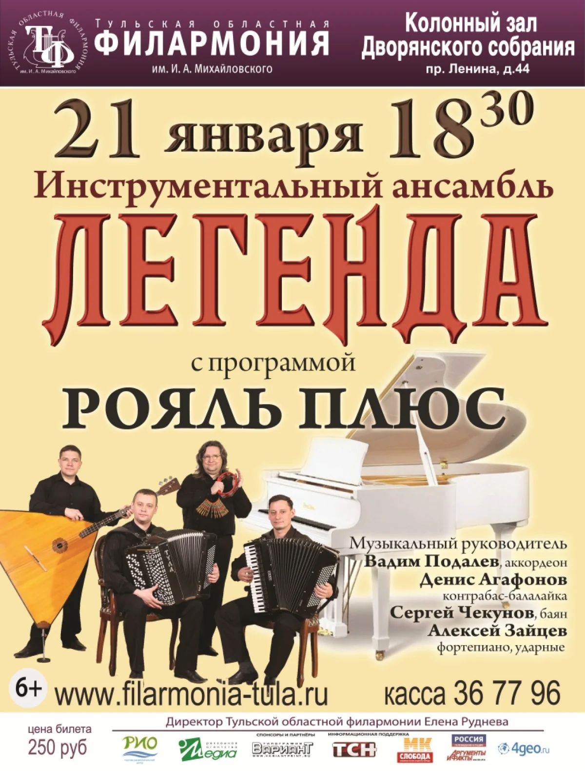 21 января 2016 г. в 18:30 в колонном Зале Дома Дворянского Собрания Тульской Областной Филармонии выступит инструментальный ансамбль «Легенда» с программой «Рояль плюс».