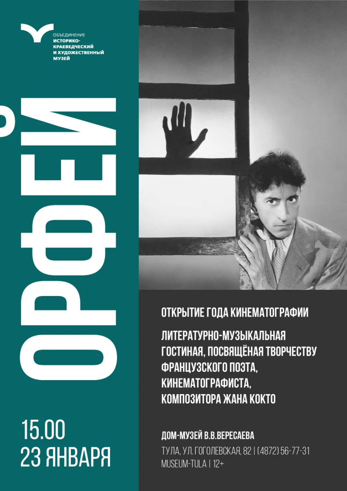 Жан Кокто был не только кинорежиссёром, но и писателем, поэтом, драматургом, художником. На протяжении всей жизни его называли «законодателем вкуса», «блистательным и скромным гением». Интерес Дома-музея В.В. Вересаева к французскому кинорежиссеру основывается на переводческой деятельности В.В. Вересаева, в личной библиотеке которого находятся книги французских писателей.