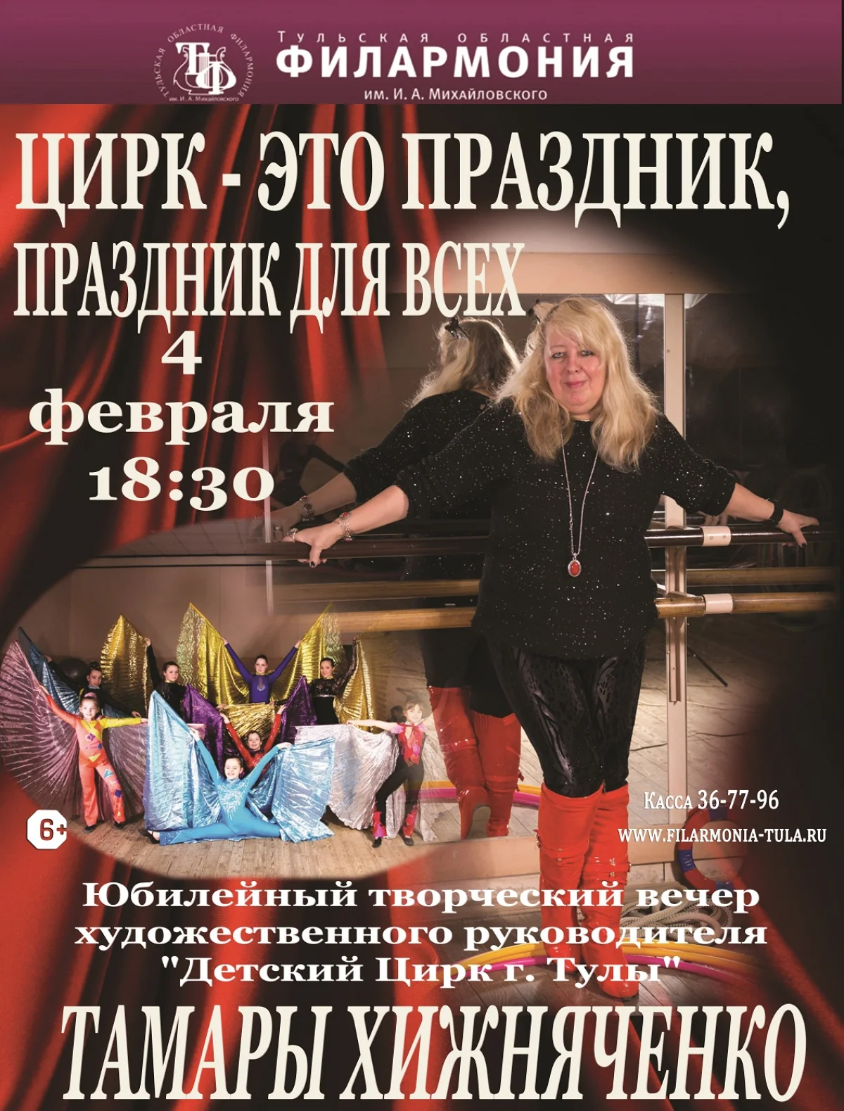 4 февраля художественный руководитель Детского цирка г.Тулы, обладатель Почетного знака «За заслуги в сфере молодежной политики» Тамара Павловна Хижняченко приглашает всех туляков на свой юбилейный творческий вечер, который пройдет на сцене Тульской областной филармонии.