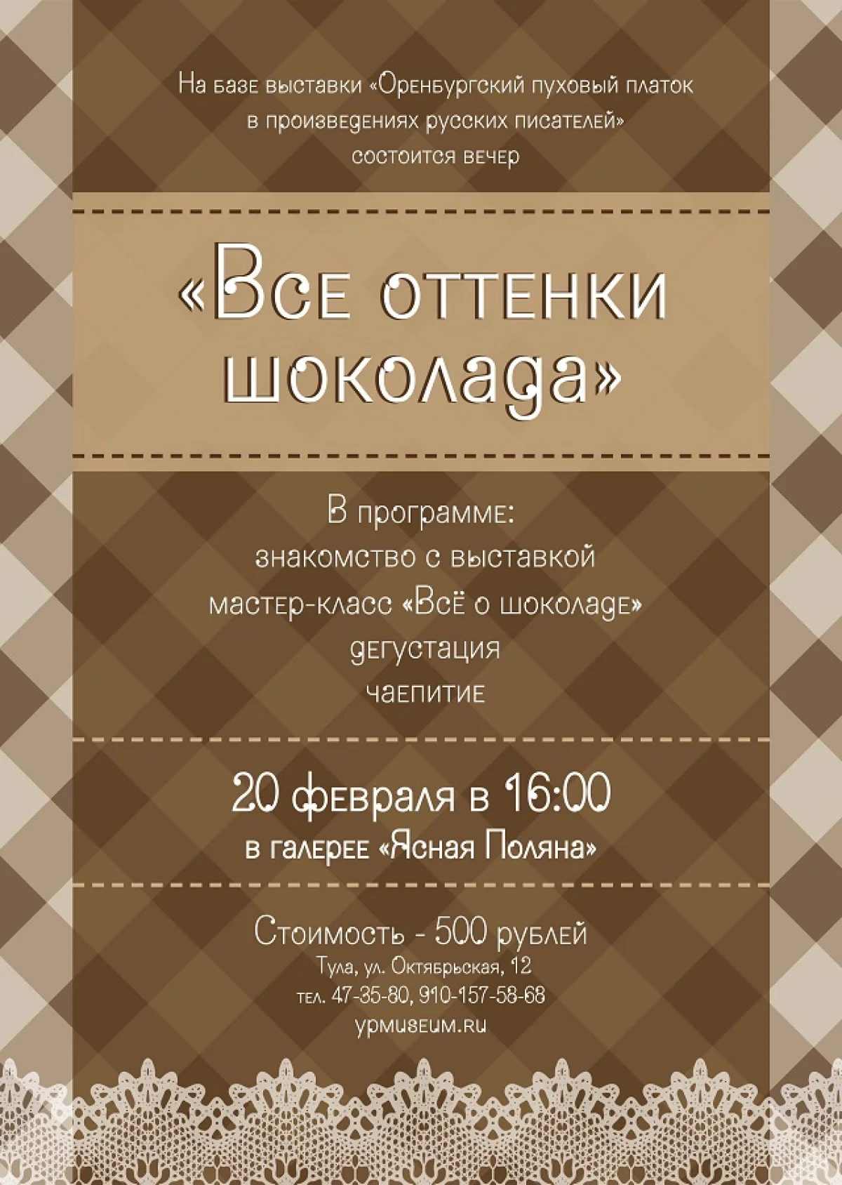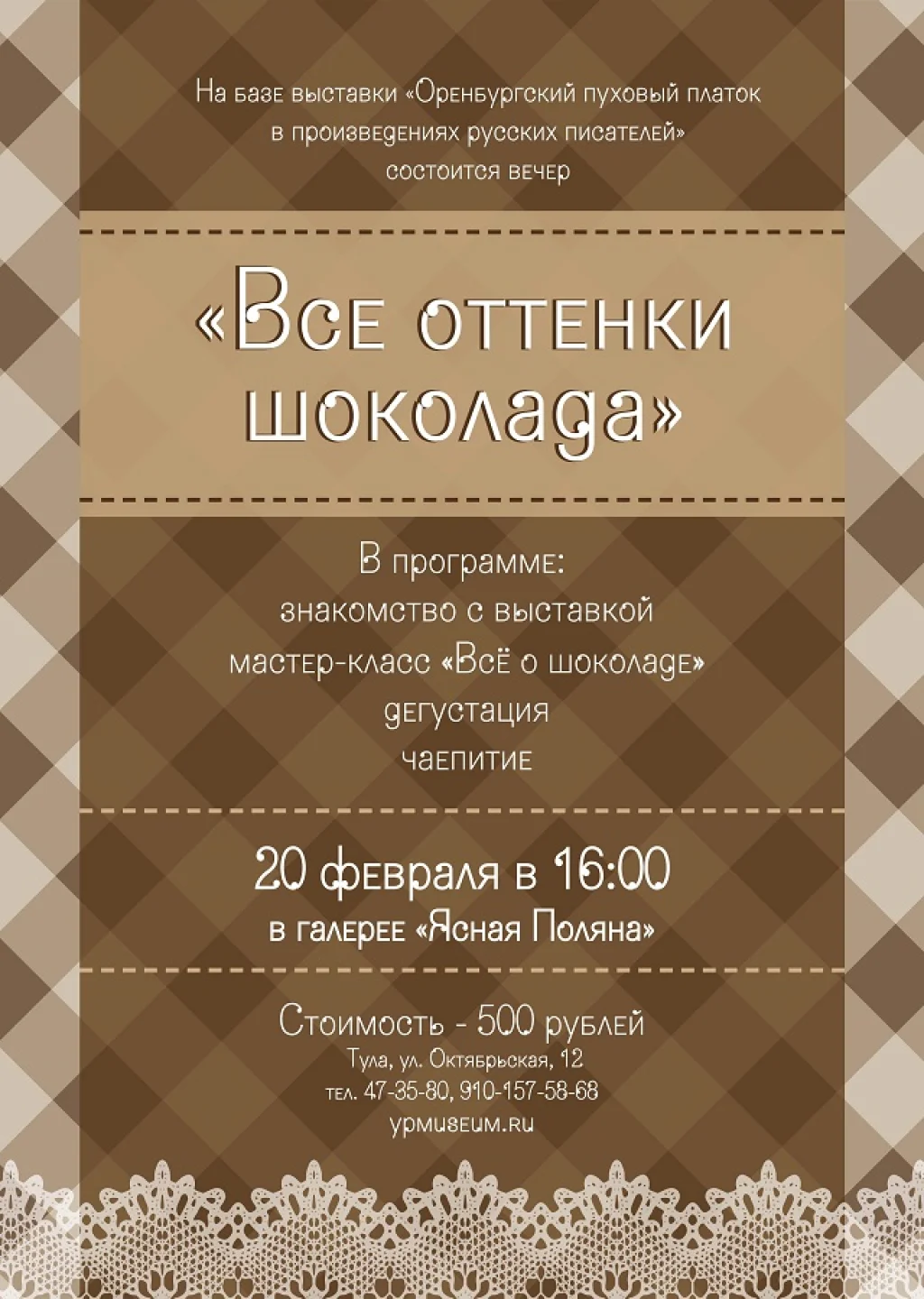 20 февраля 2016 года в 16:00 в галерее «Ясная Поляна» (Тула, ул. Октябрьская, 12) состоится увлекательный мастер-класс «Все оттенки шоколада», на котором посетители поближе познакомятся с любимым многими сладким лакомством.