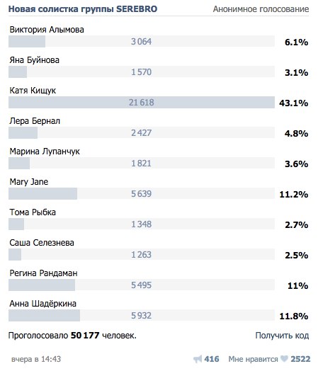 Финальная стадия кастинга была объявлена в виде голосования в официальной группе Serebro Вконтакте и длилась ровно сутки 11 апреля. В 00:00 12-го апреля начался подсчет голосов и проверка участниц на соблюдение всех правил и условий голосования.