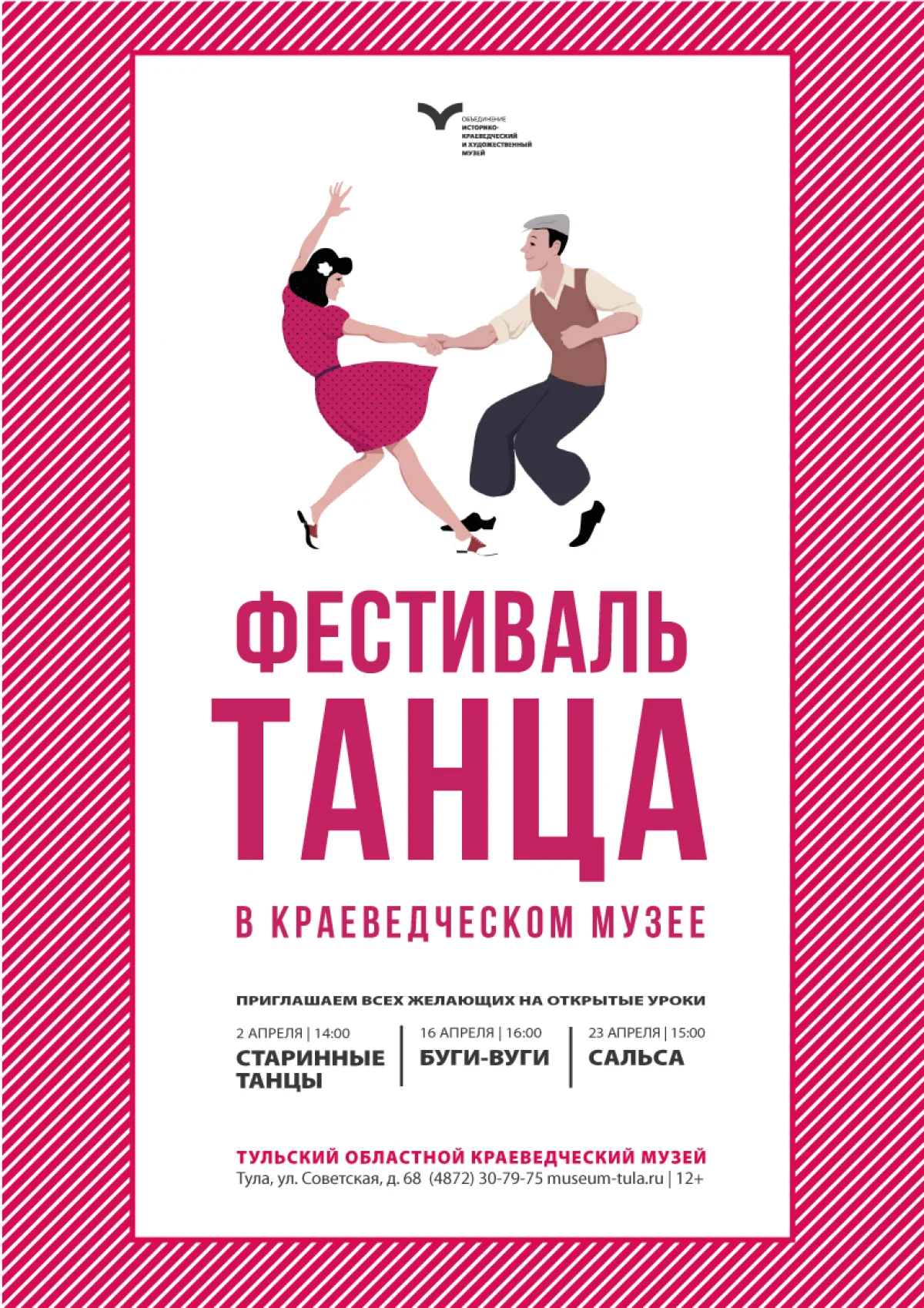 29 апреля отмечается Международный день танца. Празднуя это событие, Тульский областной краеведческий музей на протяжении месяца проводит Танцевальный фестиваль – открытые уроки по различным танцевальным направлениям.