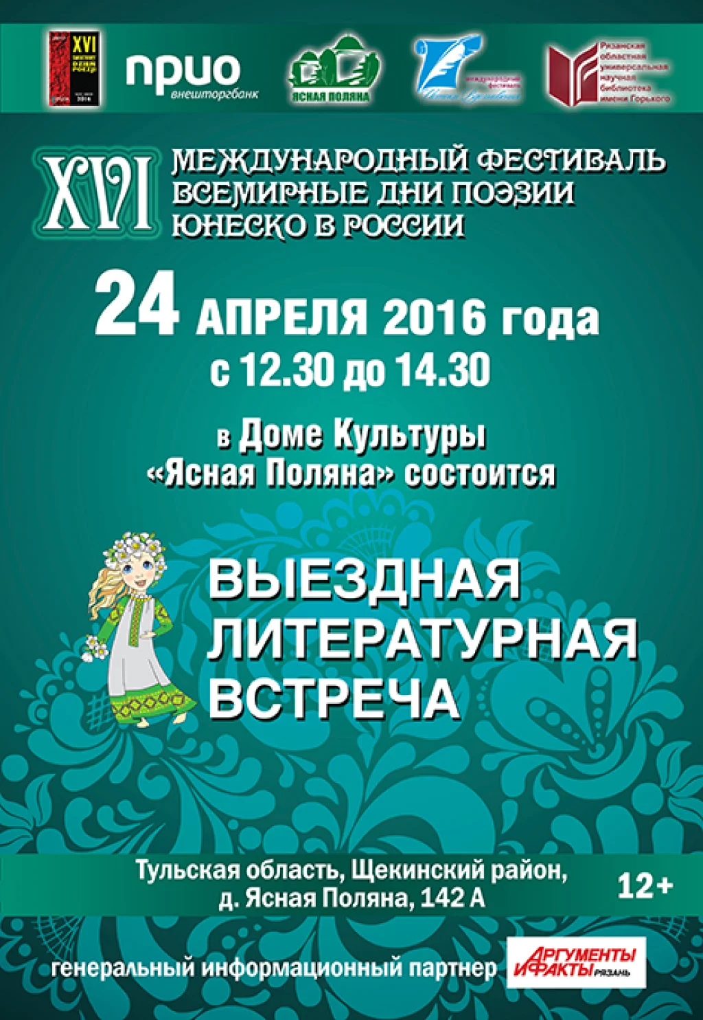 24 апреля 2016 года в Доме культуры «Ясная Поляна» (д. Ясная Поляна, д. 142А) состоится выездная литературная встреча XVI Международного фестиваля Всемирных Дней Поэзии ЮНЕСКО в России. В рамках мероприятия на сцене яснополянского ДК выступят поэты, переводчики и литераторы из Великобритании, Белоруссии, Молдавии, Польши, Украины, представители поэтического слова России и других стран.