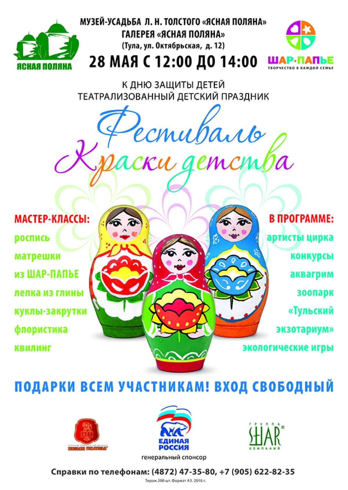 28 мая 2016 года в 12:00 в галерее «Ясная Поляна» (Тула, ул. Октябрьская, 12) начнется фестиваль «Краски детства», посвященный Дню защиты детей. Мы будем рады видеть у себя детей из Тулы и Тульской области, а также их родителей – ведь главная идея фестиваля направлена на поддержание семейных традиций.