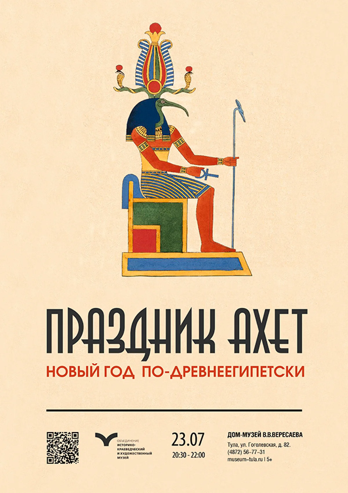 19 июля в Древнем Египте начинался Ахет – время разлива Нила, наступление древнеегипетского нового года. Дом-музей В.В. Вересаева предлагает уникальную возможность соприкоснуться с одной из самых загадочных и величественных культур человечества и встретить новый год по-древнеегипетски.