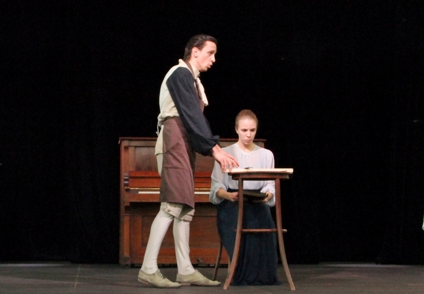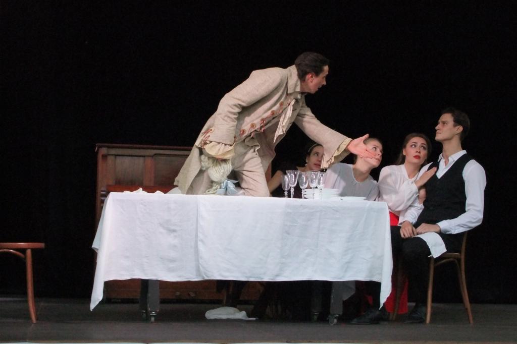 Из декораций на сцене – лишь клавикорды, стол, накрытый на 5 персон и несколько стульев. Остальной реквизит по мелочи: мятые конверты и письма на старой бумаге, графин с водкой, станок отца, появлялся с самими актерами. А актеры выходили, просто нельзя не заметить, очень четко. Педантичный взгляд не увидел ни одного промаха в выходе актеров, звуковом или световом сопровождении. А действие спектакля не ограничивалось одной лишь сценой. Персонажи появлялись кто из-за зрительского зала, кто из боковых кулис, а кто даже из рядом стоящего домика.