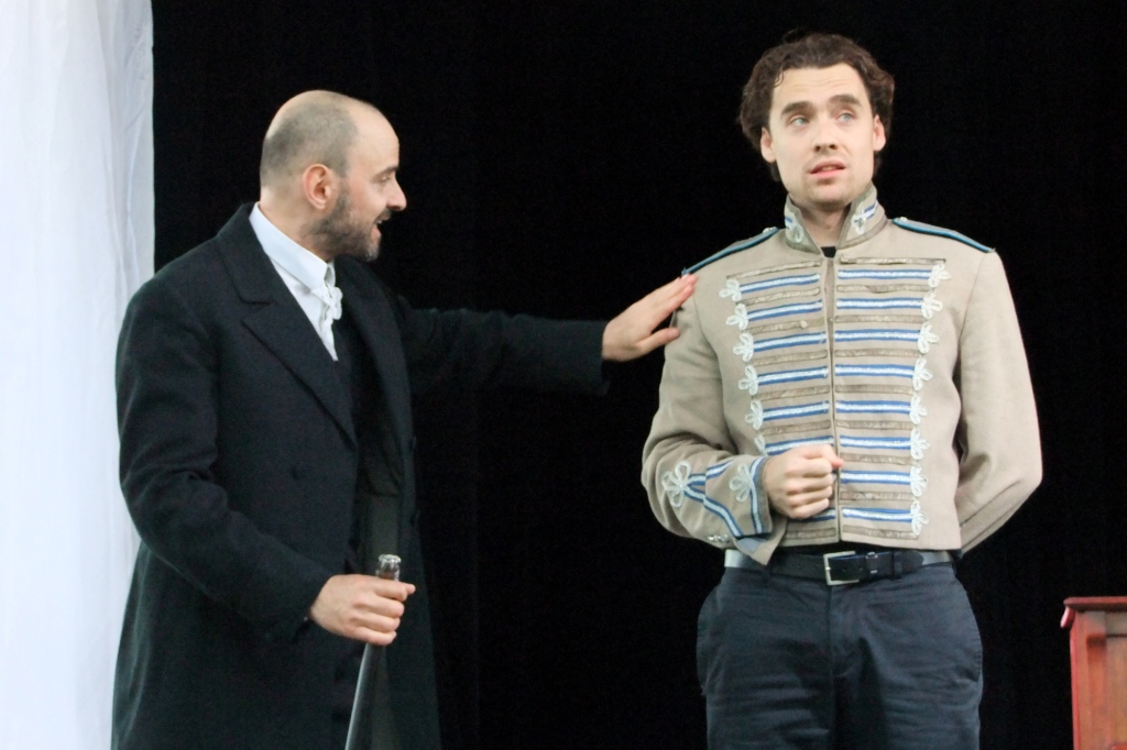 Жила Марья с отцом-деспотом по четко заведенному, совершенно каждый день одинаковому порядку. И эта одинаковость режиссером была передана максимально щепетильно. Повторяющиеся движения, закольцовывающие действие, одинаковые слова. Отец олицетворяет собой черствость и порядок. Его играет молодой парень Олег Кузнецов, который поначалу кажется даже моложе «своей» дочери. Но в ходе спектакля впечатление о его возрасте стирается. И в итоге, не смотря на молодость, глаза его начинают казаться старческими, живые движения кажутся жестами чрезмерно активного старика. Он очень эмоционален. И это скорее положительный герой, нежели отрицательный. Если в этой постановке вообще есть отрицательные персонажи. Каждому можно посочувствовать, даже вероломной француженке m-lle Bourienne (Евгения Розанова), вначале отчаянно ищущей поцелуя сначала у Андрея Болконского (Марк Вдовин), затем у Анатоля Курагина (Иван Титов), а потом мечущейся от страха, видя взбунтовавшихся русских мужиков. Но положительным отца сделала именно любовь его дочери, которая так смотрела на него, оправдывала и потакала во всем. Именно отец вызывал в зале взрывы смеха и аплодисменты. Несмотря на его строгость, над тем, что он делал, нельзя было не улыбаться. И он не мог не понравиться.