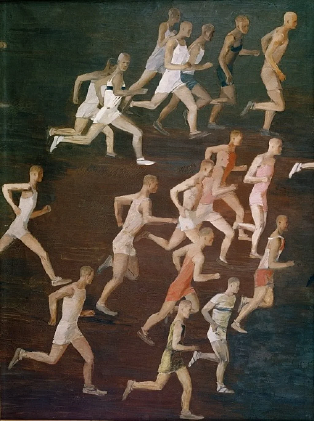 В своем творчестве Александр Дейнека неоднократно обращался к теме спорта («Вратарь», 1934; «Игра в мяч», 1927 и др.). На картине «Бег» художник изображает многочисленных спортсменов, бегущих на длинную дистанцию. Фрагментарная композиция подчеркивает движение спортсменов: кто-то из них только «вбегает» в живописное пространство, кто-то выбегает и видна только нога, но отсутствие четкого ритма и диагональная композиция (снизу вверх, слева направо) помогают художнику передать ощущение огромной дистанции и усталости спортсменов. То, что спортсмены не обладают индивидуальными характеристиками, а также высокая точка зрения, придают произведению монументальность.