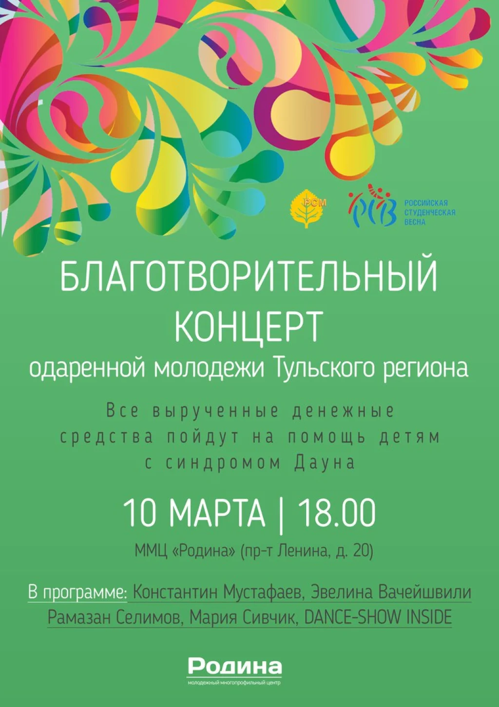 В рамках Тульской студенческой весны 10 марта в 18:00 в молодежном центре «Родина» (пр. Ленина, д. 20) состоится благотворительный концерт одаренной молодежи региона.