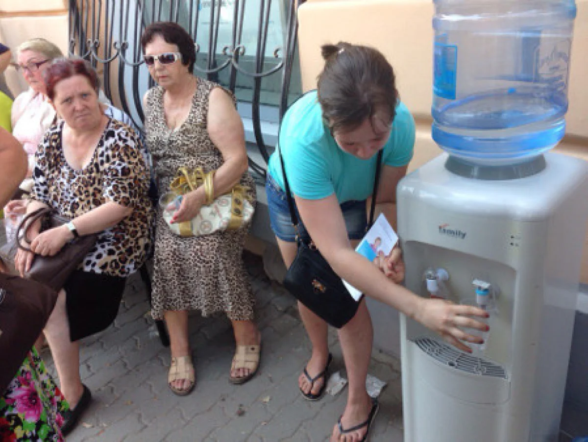 . Дело осложняется тем, что на улице стоит жара, а в ожидании людям приходится проводить довольно длительное время. Некоторые простаивают в очереди до двух часов.