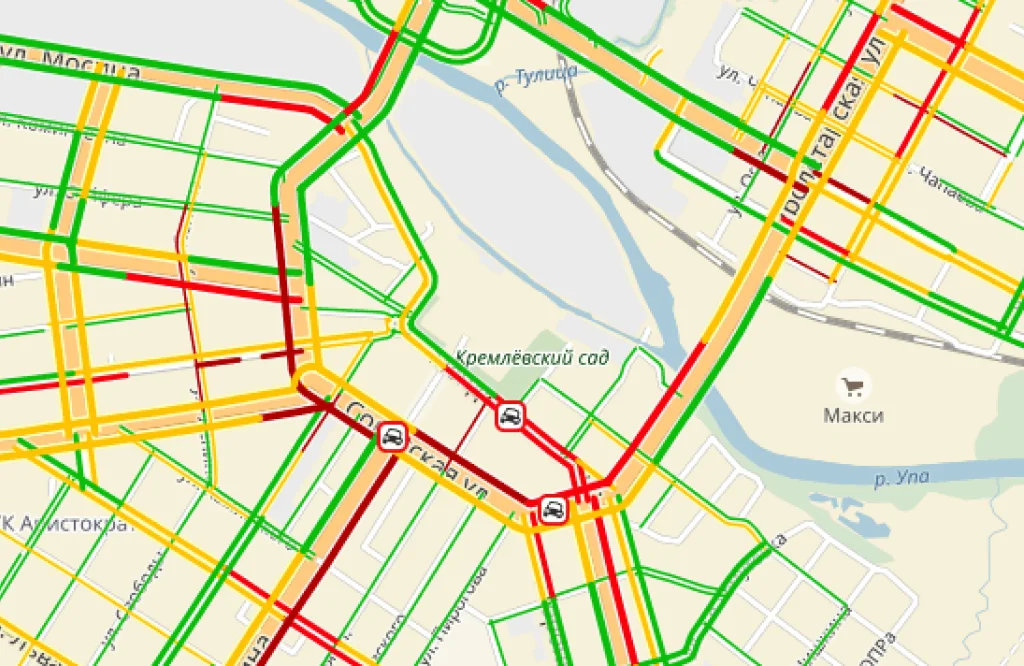 Движение затруднено на улице Советской, от ул. Ложевой до проспекта Ленина, а также по проспекту Ленина до ул. Льва Толстого.