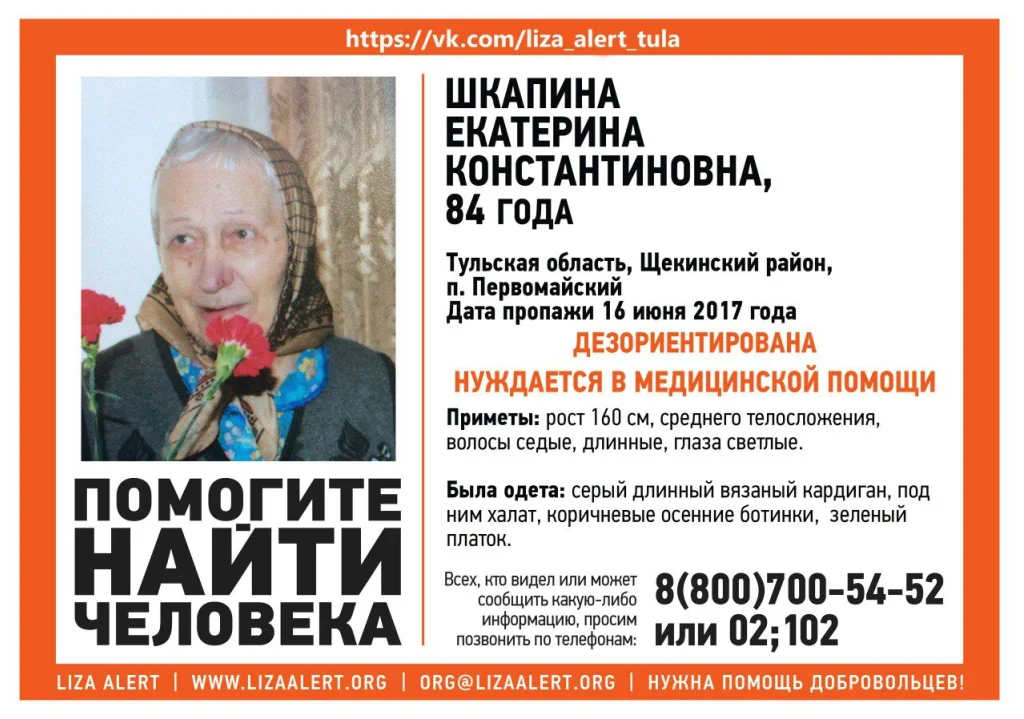 16 июня в 18:00 ушла из дома в п. Первомайский Щекинского района в неизвестном направлении. До сих пор ее местонахождение неизвестно.