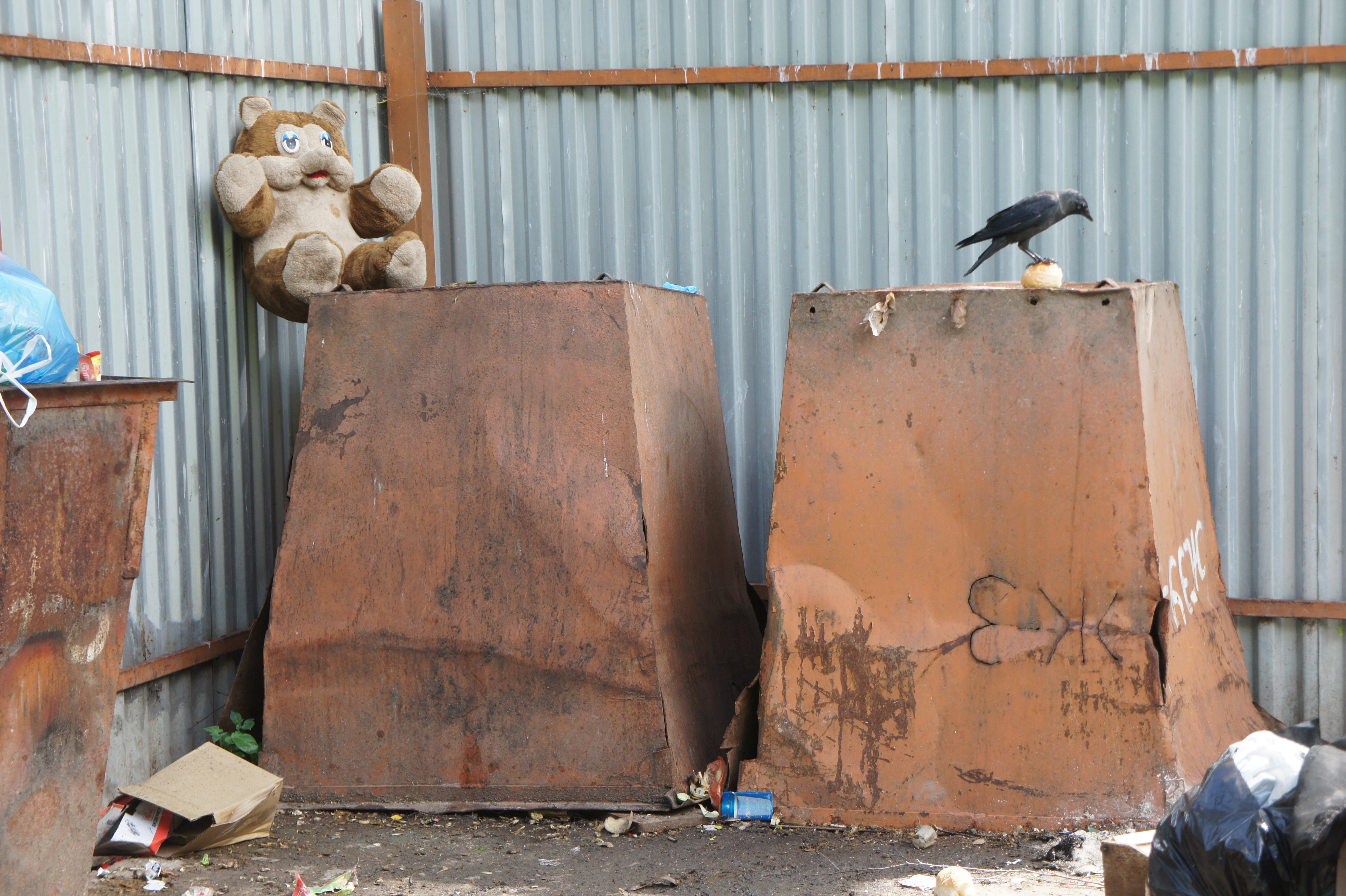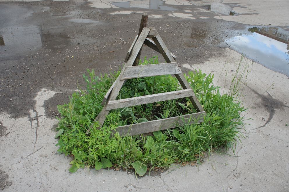 Так один из отсутствующих люков зарос травой и сорняками и стал своеобразной клумбой. Другой люк придавлен спинкой от кресла и автомобильной шиной.