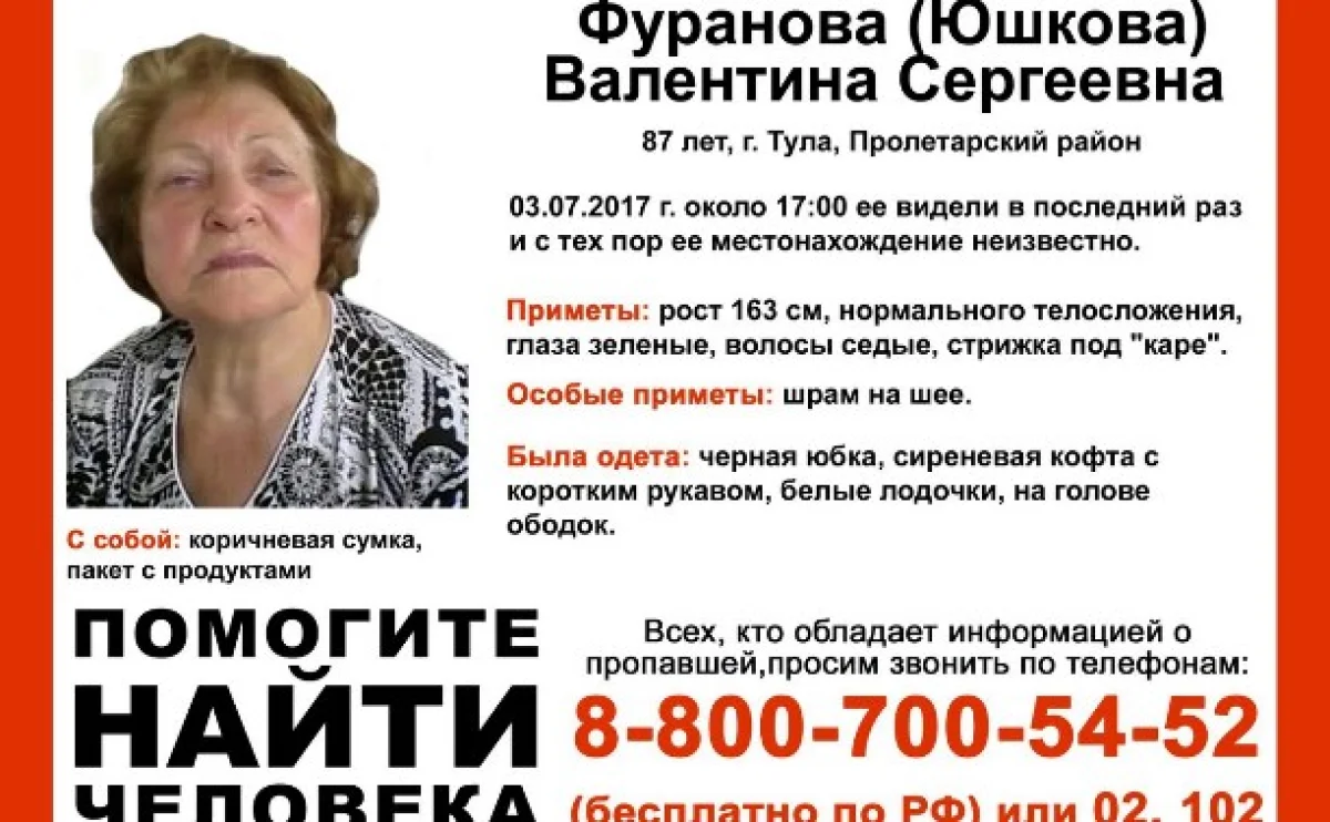 Как сообщает служба «Лиза Алерт»,в Пролетарском районе 3 июля 2017 года вышла из домой и не вернулась 87-летнея Валентина Сергеевна Фуранова (Юшкова). Пожилая женщина пропала в Пролетарском районе Тулы, о её местонахождении уже больше суток ничего неизвестно.