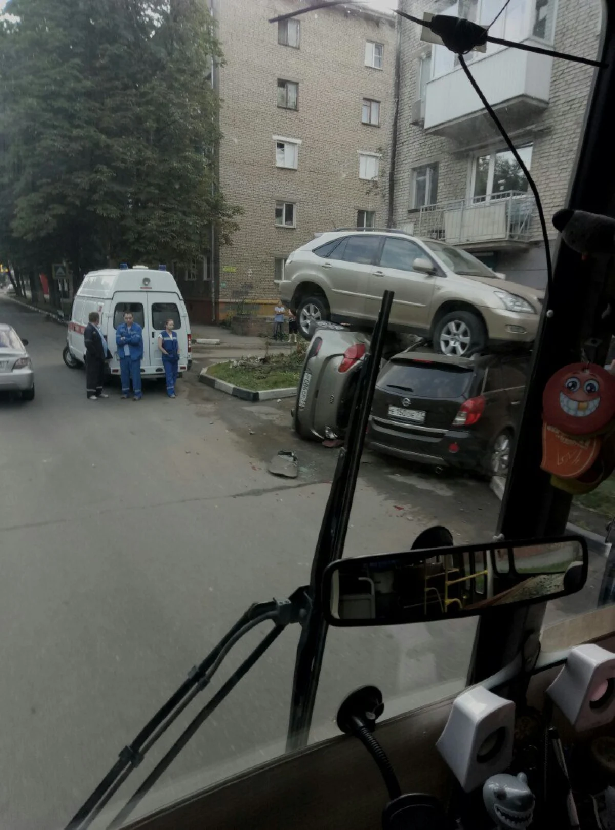 Автомобиль "Лексус", предположительно, врезался в клумбу, "подлетел" и приземлился на 2 припаркованных авто.