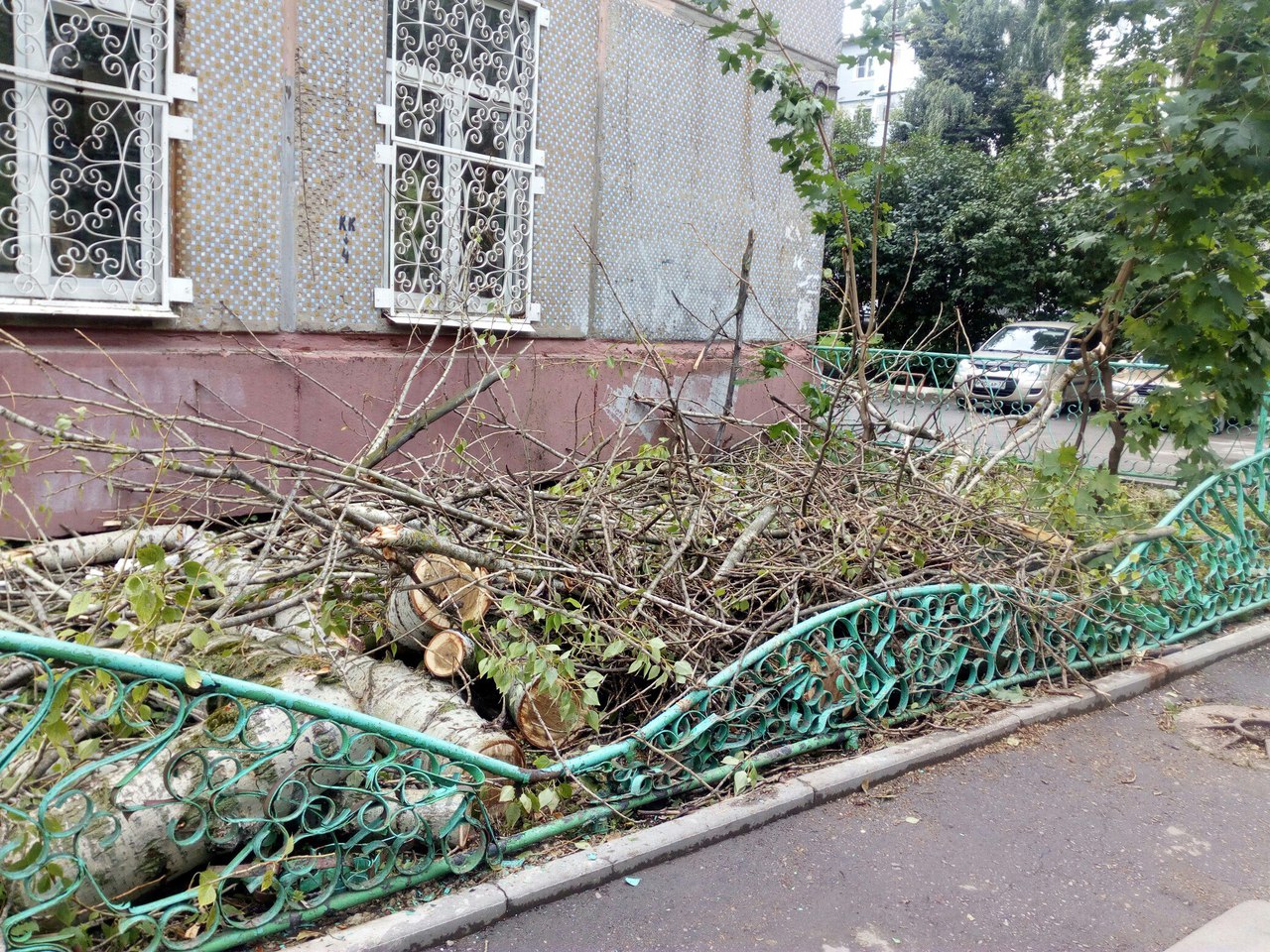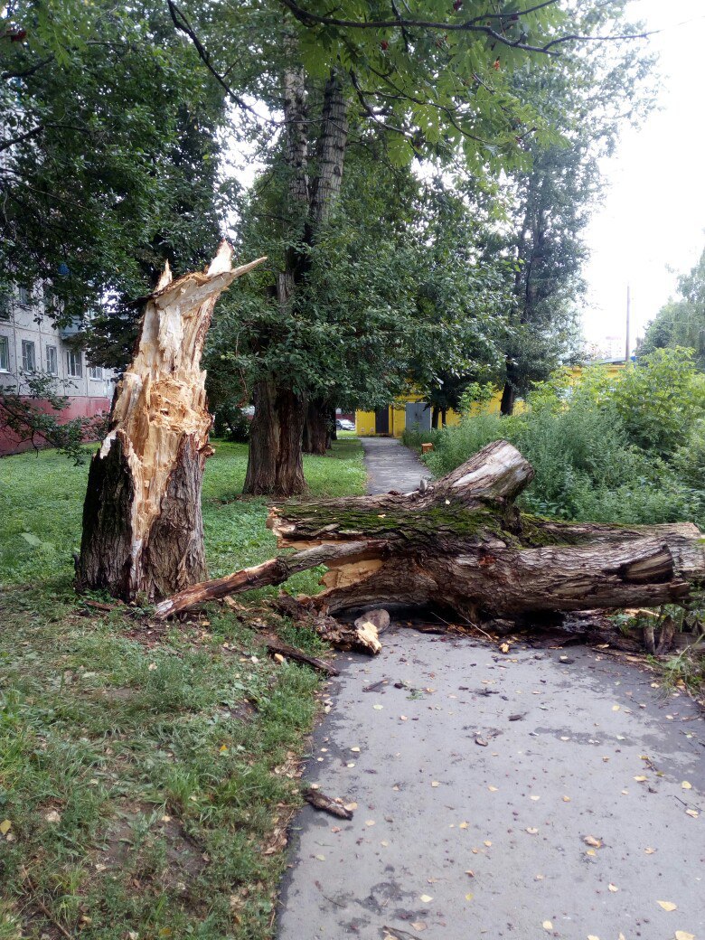 Сильный ветер, гром и молния во время ночного ненастья обрушили дерево, а также сорвали ветки и повредили стену