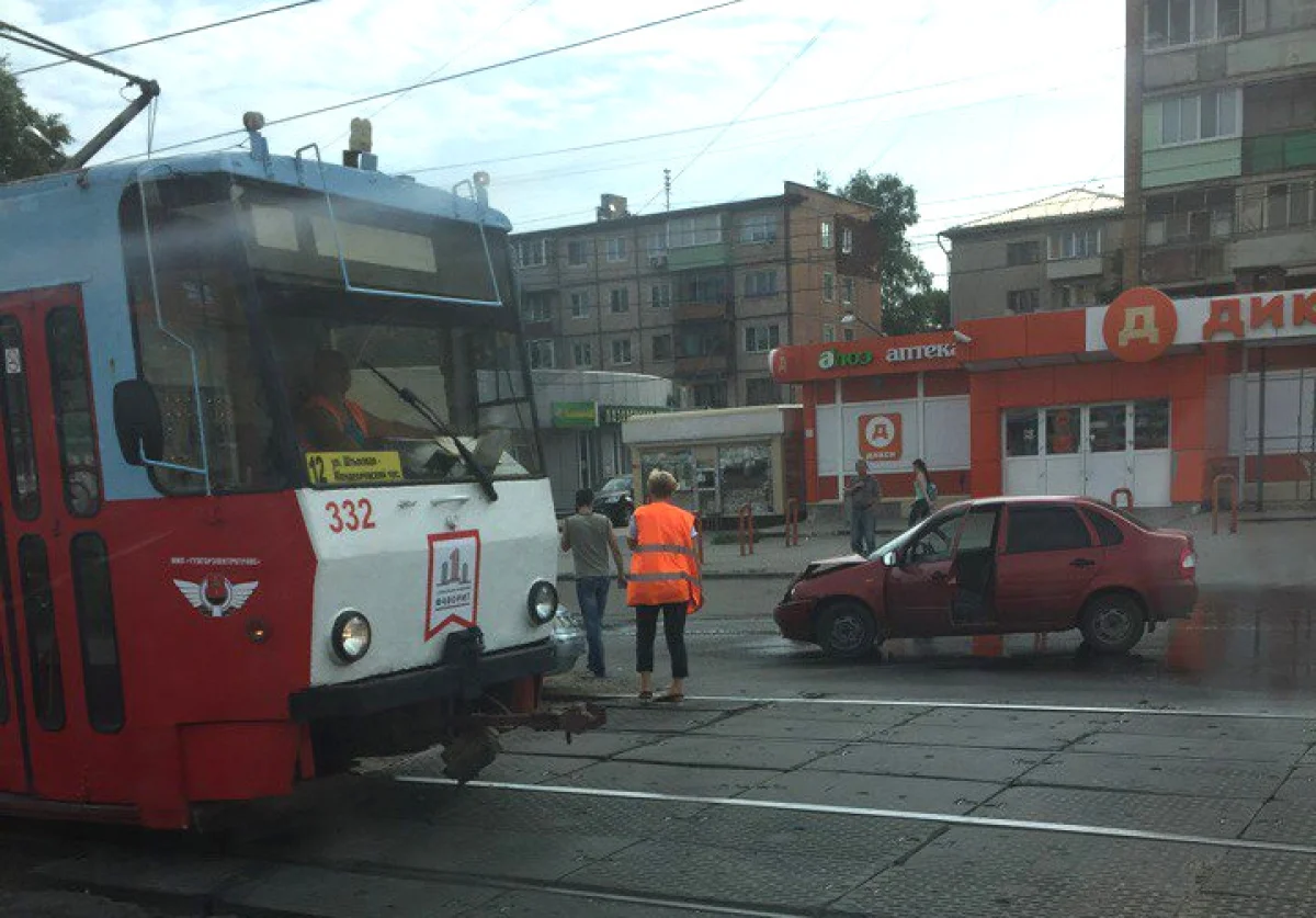 Машины столкнулись прямо на трамвайных путях, в результате чего образовался небольшой затор. Трамваи стоят в сторону центра.