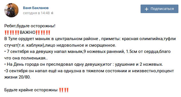 В соцсетях распространяется информация о том, что в Туле орудует маньяк. Он якобы ходит в красной олимпийке и нападает на молоденьких девушек.