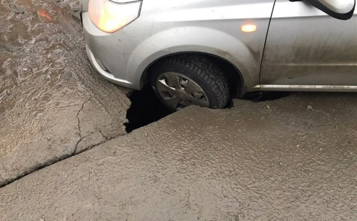 В центре Тулы автомобиль провалился в гигантскую дыру в асфальте