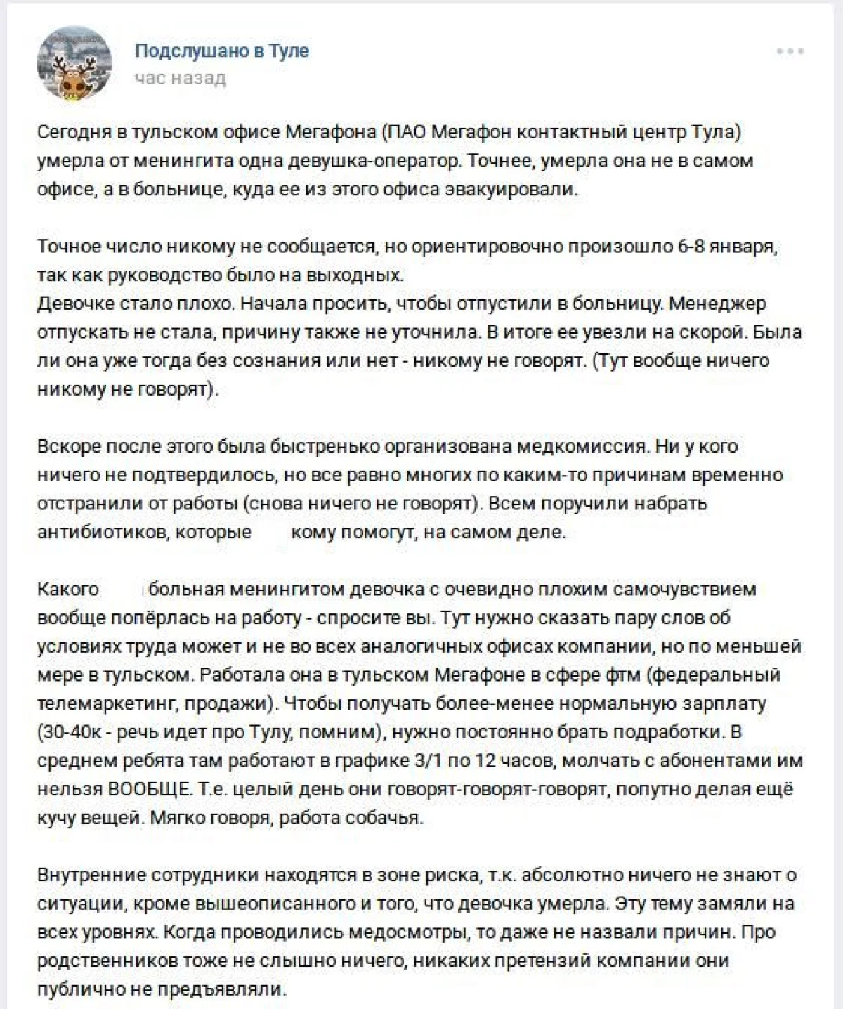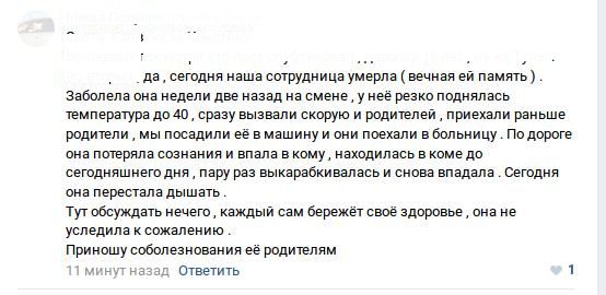 «Изложенная в посте информация не вполне соответствует действительности. 8 января наша коллега пришла на работу, признаков заболевания у нее не было. Во второй половине дня сотрудница почувствовала недомогание, ответственный менеджер сразу освободил коллегу от работы. От вызова скорой помощи сотрудница отказалась. Домой она отправилась в сопровождении подруги. Все это время она была в сознании. Лечение продолжила дома. Скорая помощь была вызвана на следующий день. Когда мы узнали о диагнозе, то провели все профилактические меры среди сотрудников под наблюдением врачей. Мы глубоко переживаем трагедию, случившуюся с нашей коллегой, и передаем слова поддержки родственникам, близким и друзьям. Компания «МегаФон» и сотрудники оператора обязательно окажут помощь родственникам девушки», - говорится в сообщении.