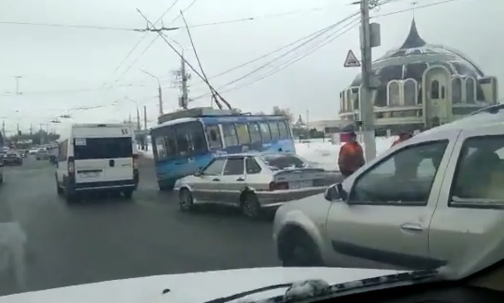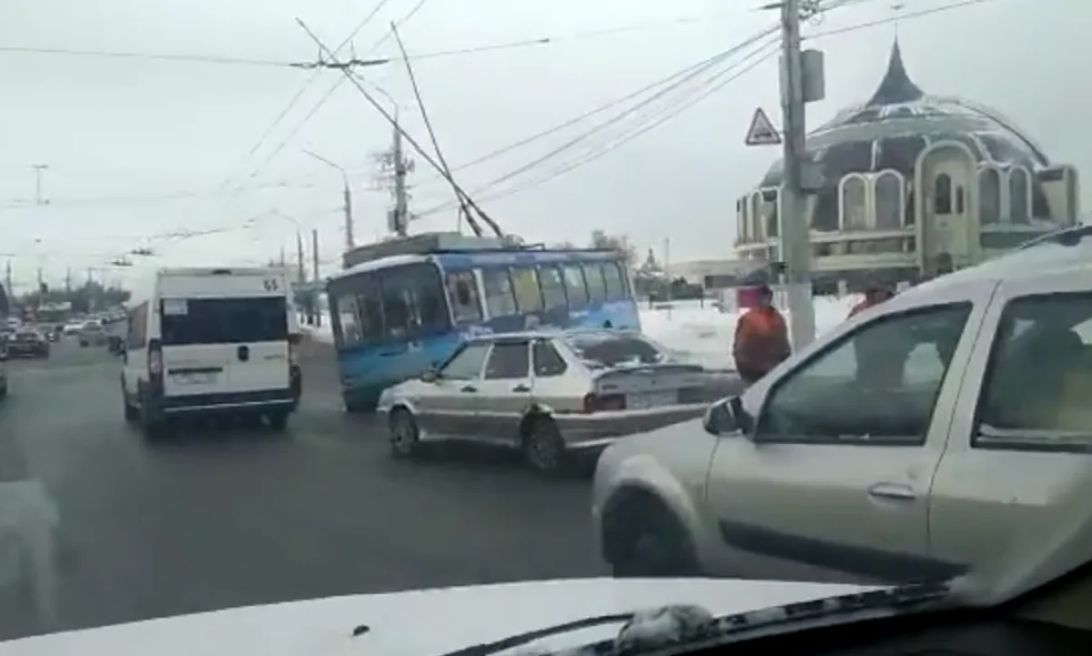 Как сообщают очевидцы, в час пик на ул. Октябрьской, при въезде на Зареченский мост, троллейбус вылетел на трамвайные пути.