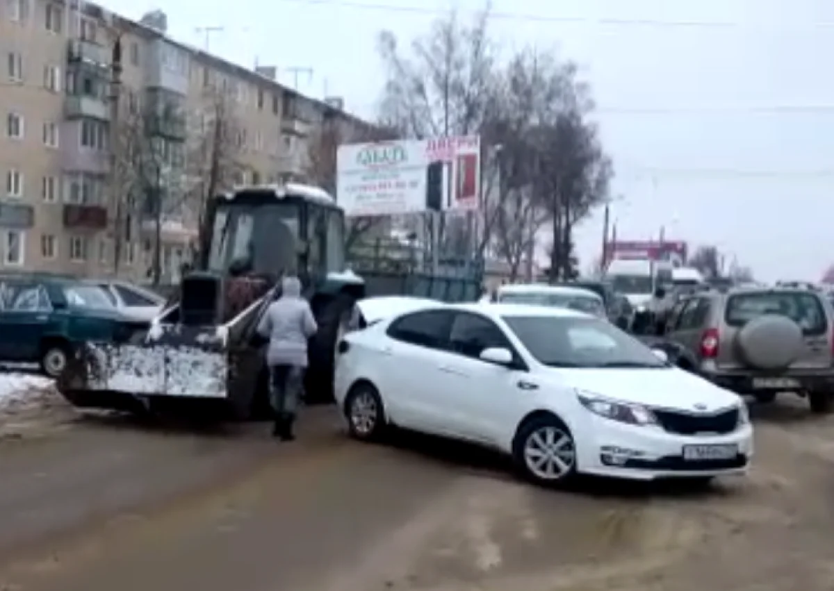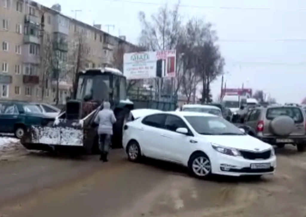 Около дома №15 на улице Советской трактор с прицепом снес ковшом багажник автомобиля «Kia». По предварительным данным, никто не пострадал.