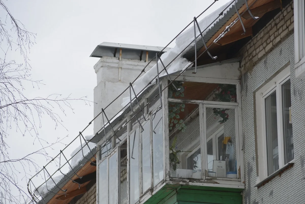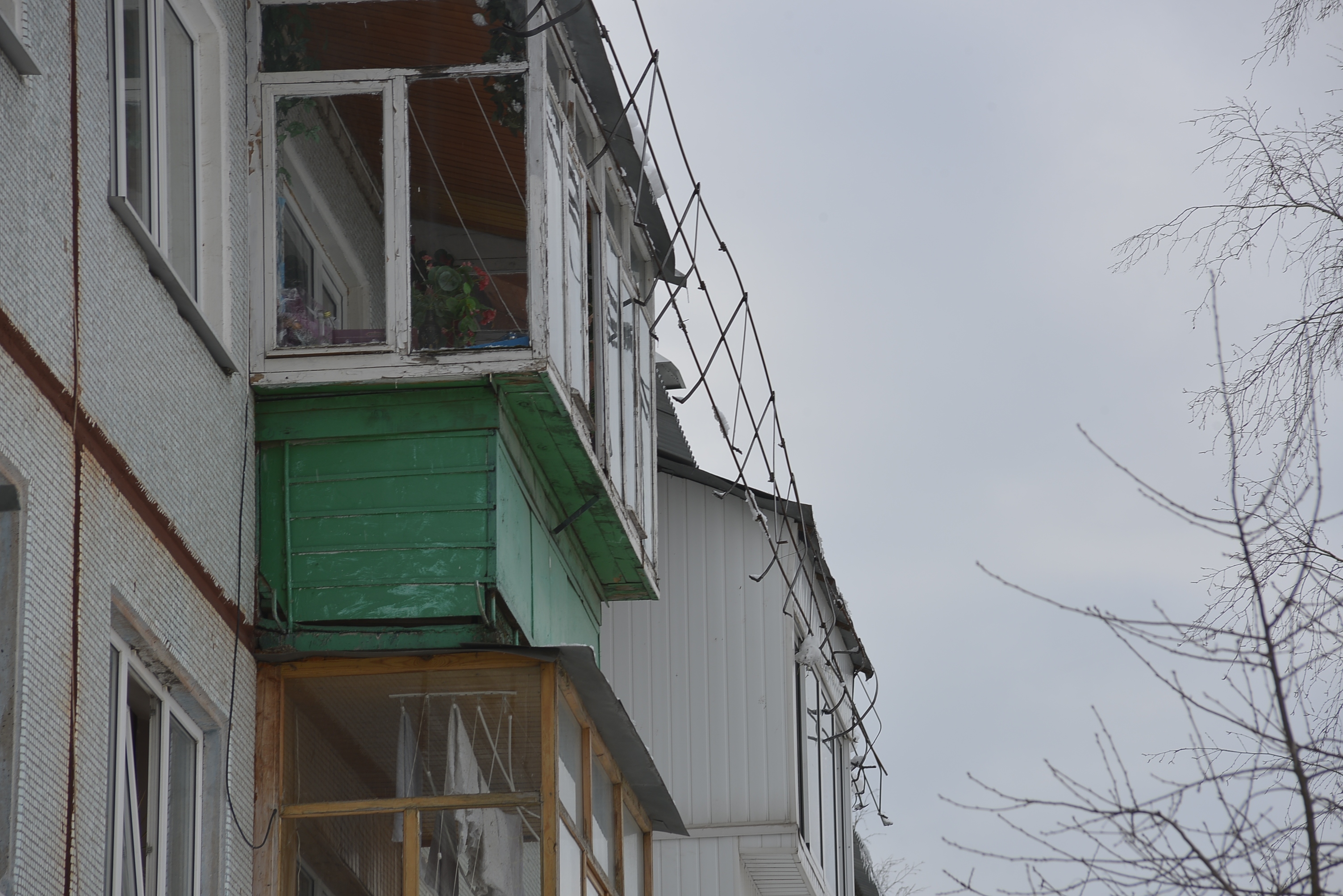 Видимо при повышении температуры воздуха снежный покров на крыше стал таять и медленно съезжать, потащив за собой и ограждение на крыше. Сейчас оно повисло на балконах.