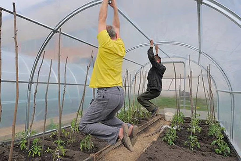 Мужчины, думая, что за ними никто не наблюдает, разобрали металлический парник и вместе с ним покинули участок.