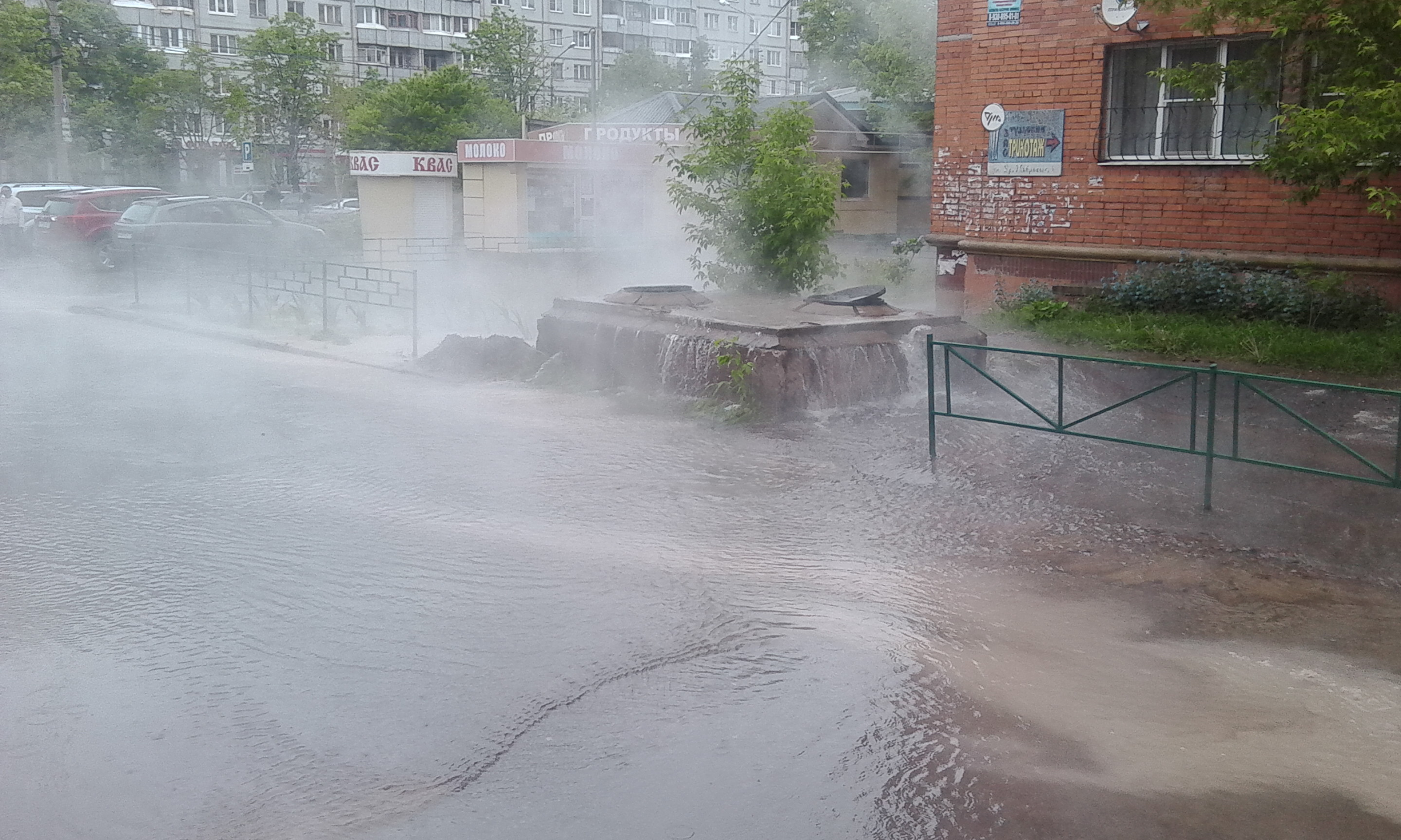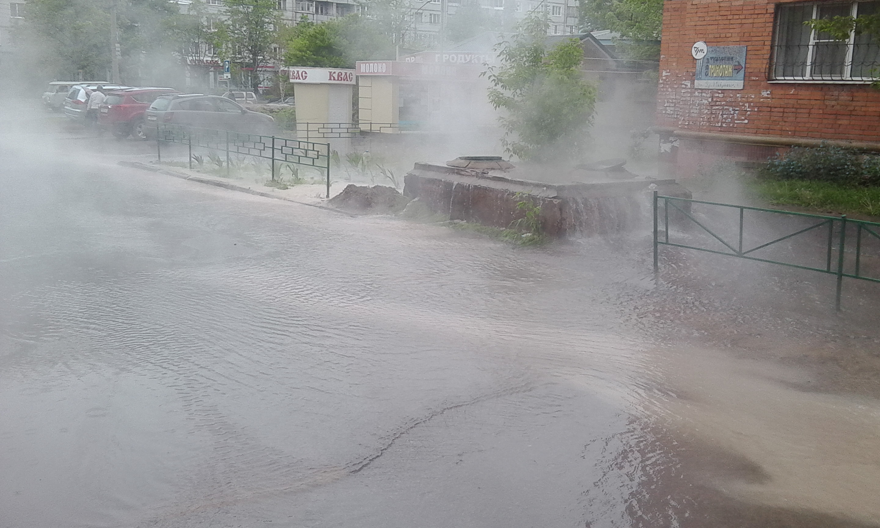 с ул. Бр. Жабровых прорвало трубу. Кипяток льётся рекой по улице, заливая тротуары и проезжую часть.